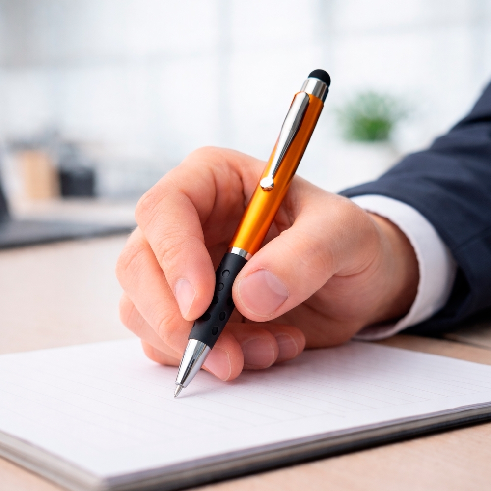 Caneta plástica com ponta, clip e pequenos detalhes em metal, além de detalhes ergonômicos na área próxima à tampa. Possui acionamento por rotação, carga esferográfica azul de 1.0mm e ponteira emborrachada para interação com dispositivos de telas sensíveis ao toque.