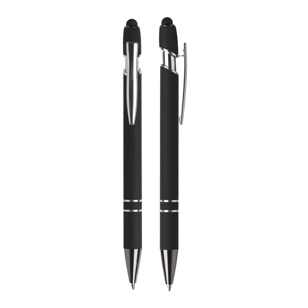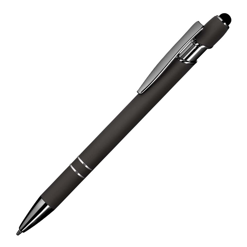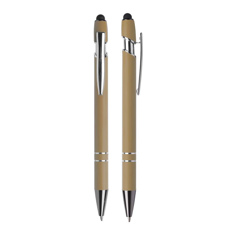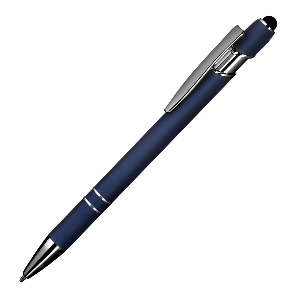 Caneta esferográfica em metal escrita em azul com corpo emborrachado. Refil tipo parker com ponta touch emborrachada.