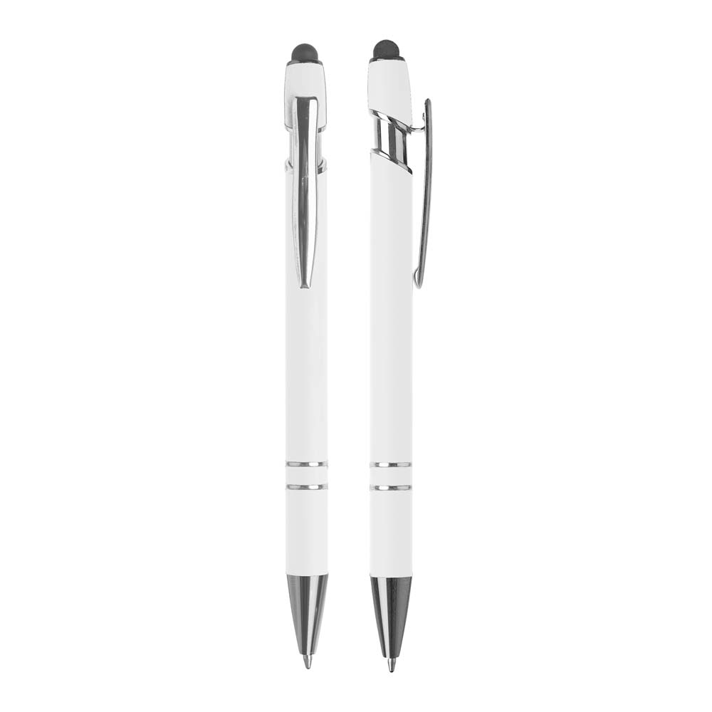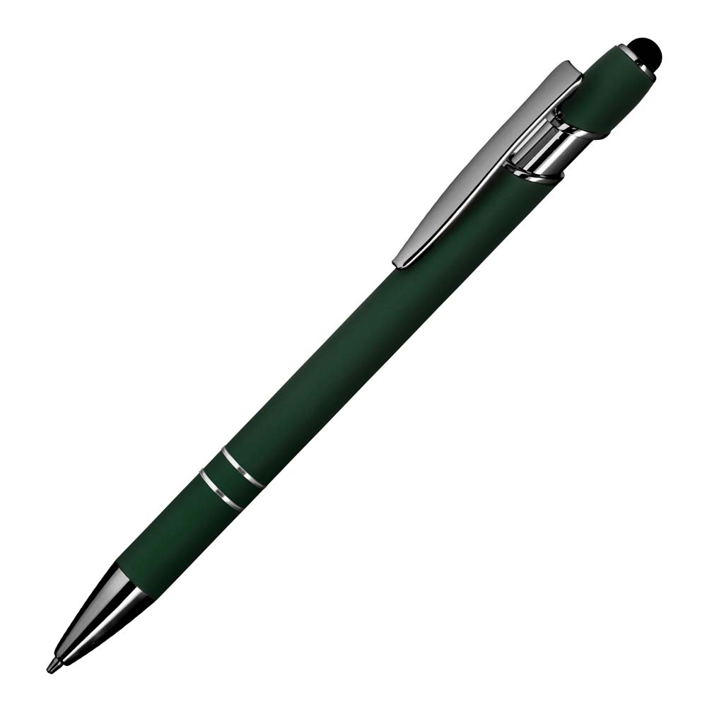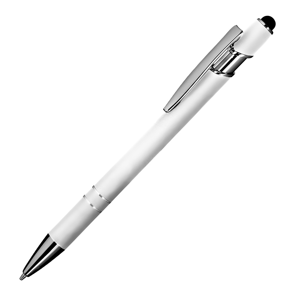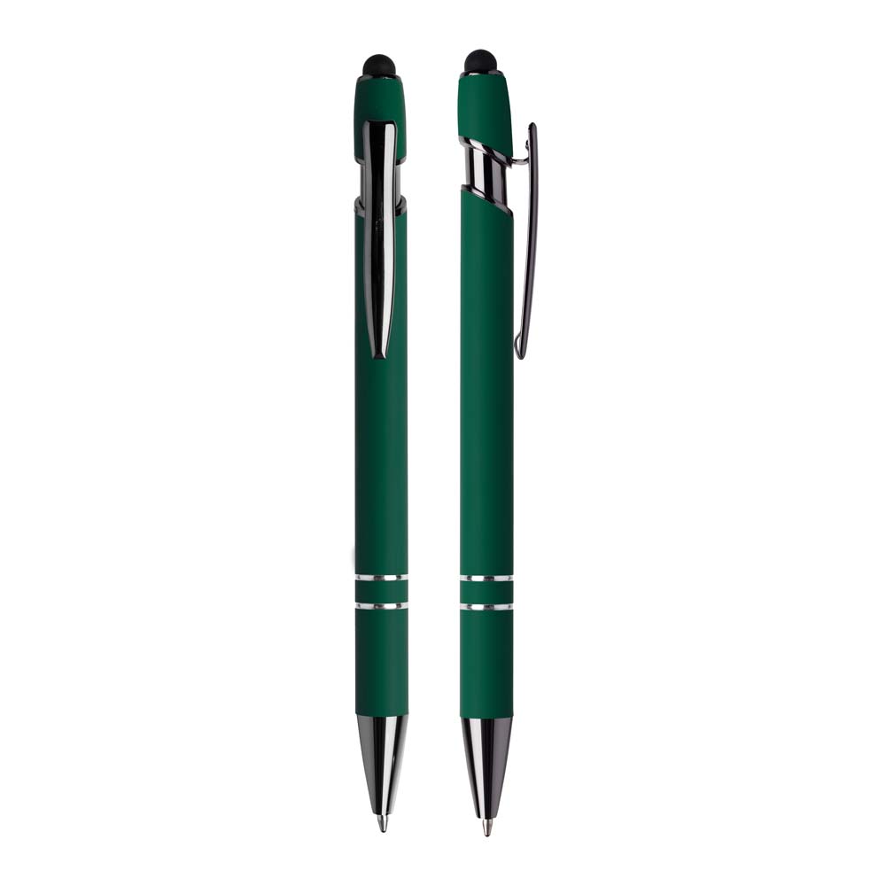 Caneta esferográfica em metal escrita em azul com corpo emborrachado. Refil tipo parker com ponta touch emborrachada.