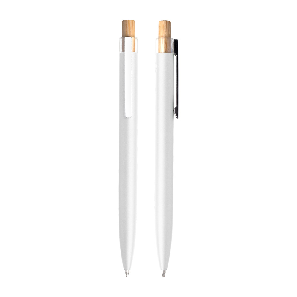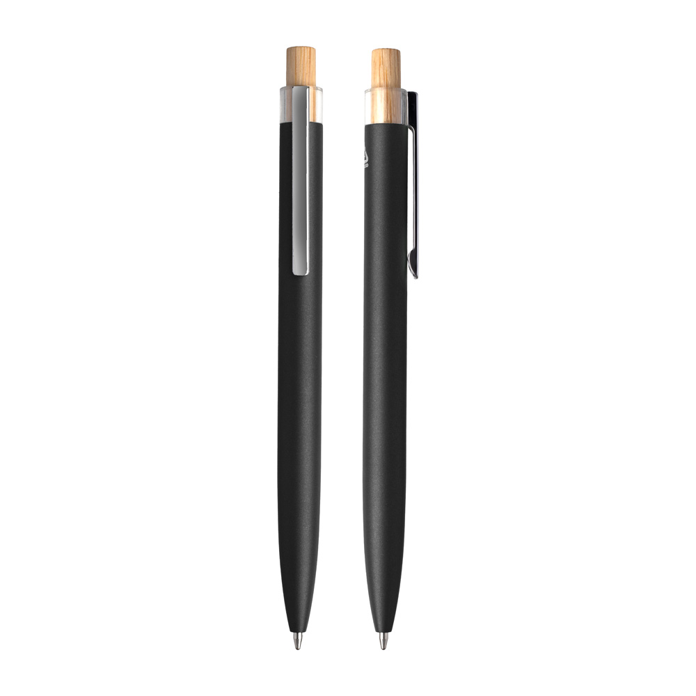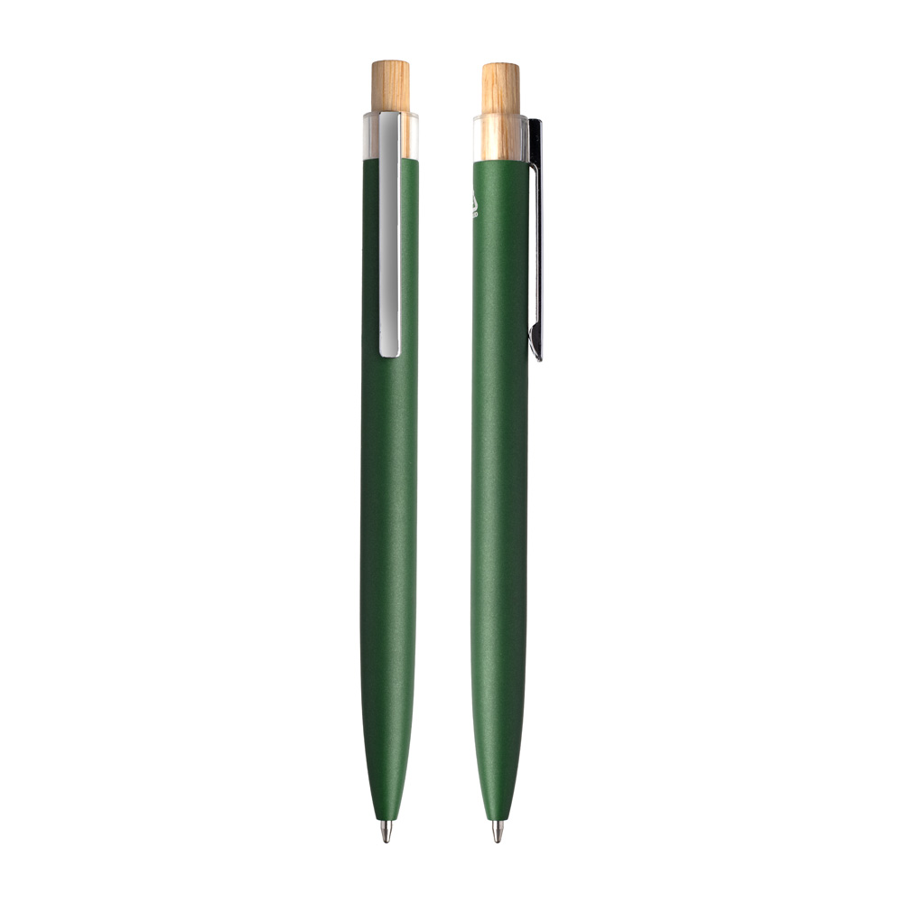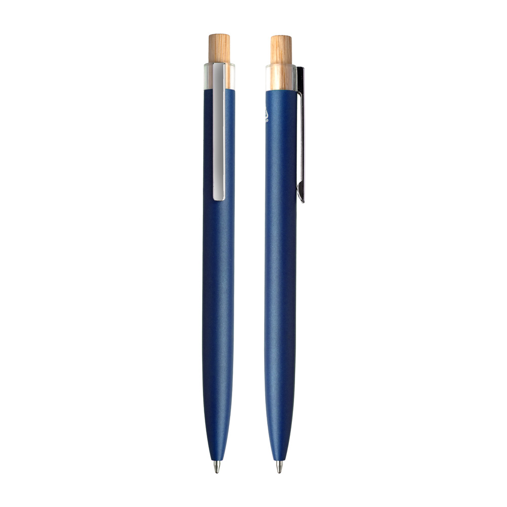 Caneta esferográfica em alumínio reciclável com escrita em azul. Refil parker e acionador em bambu.