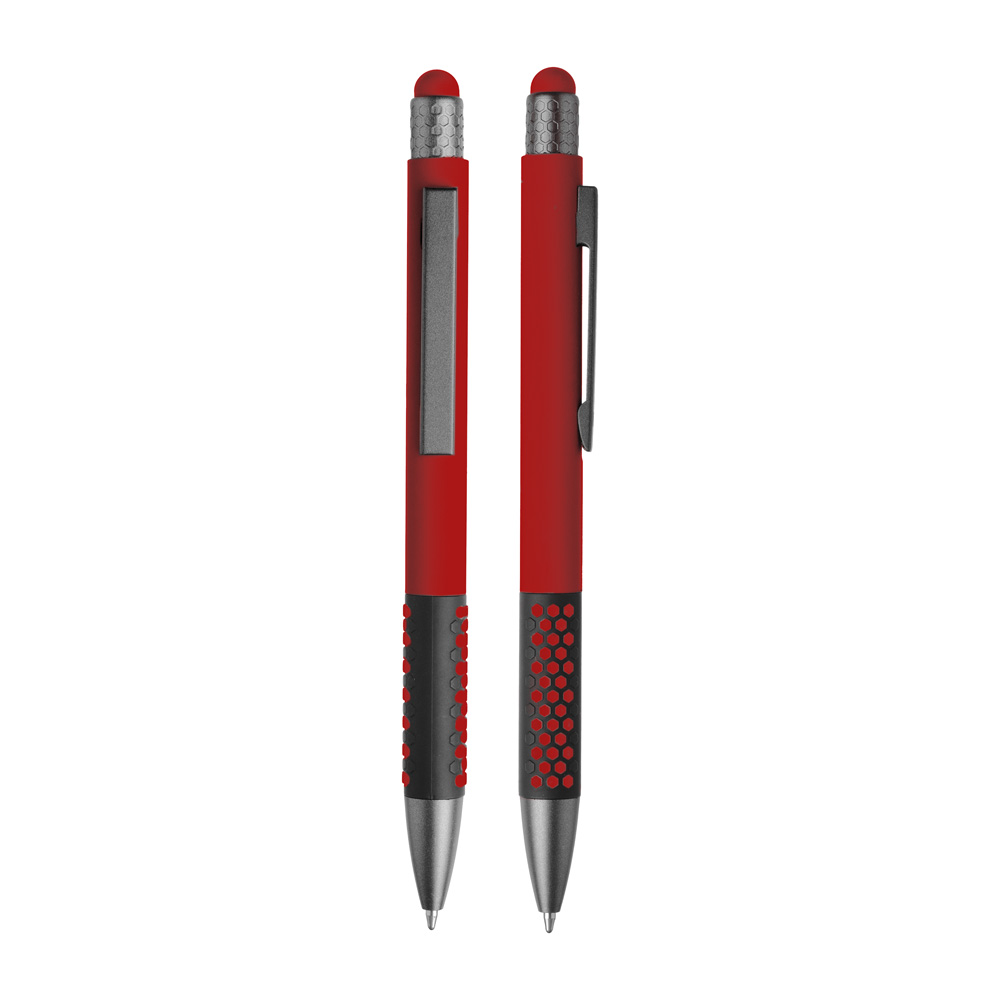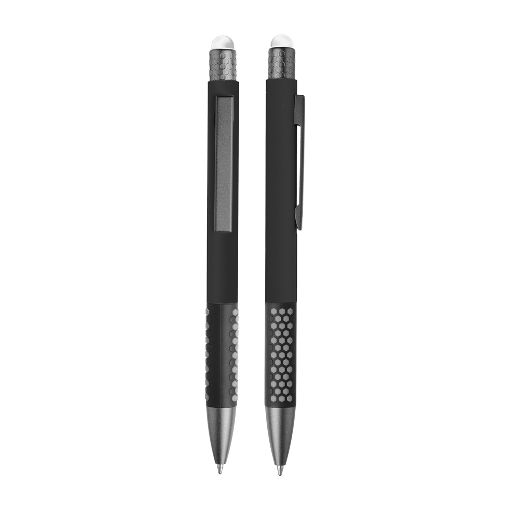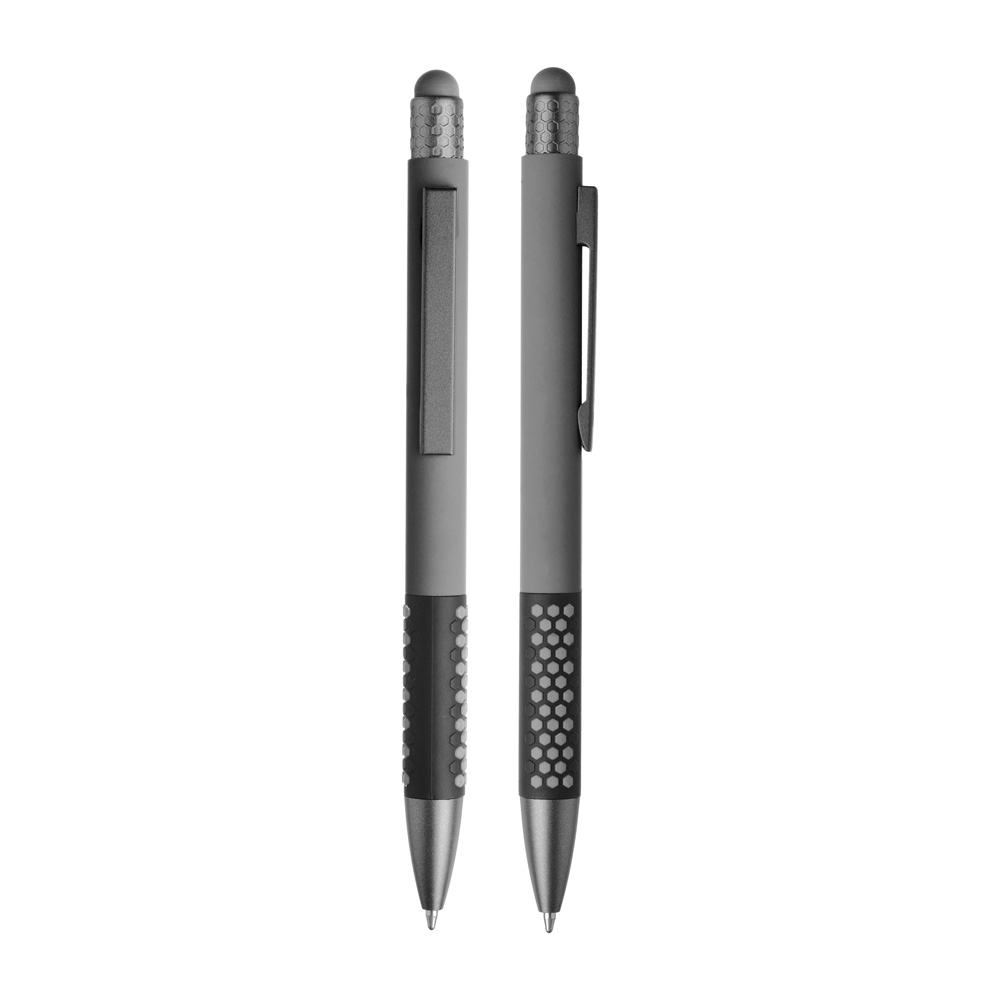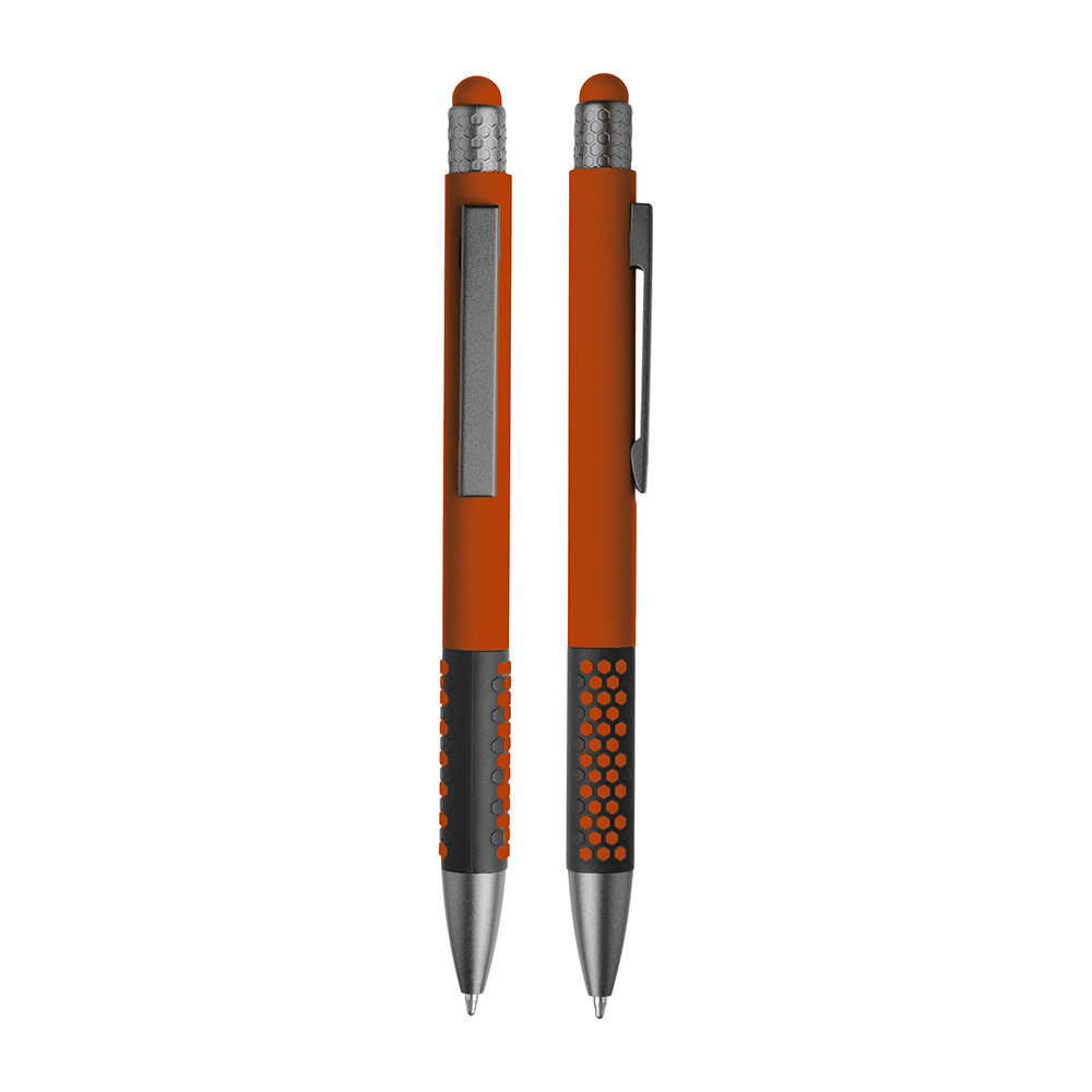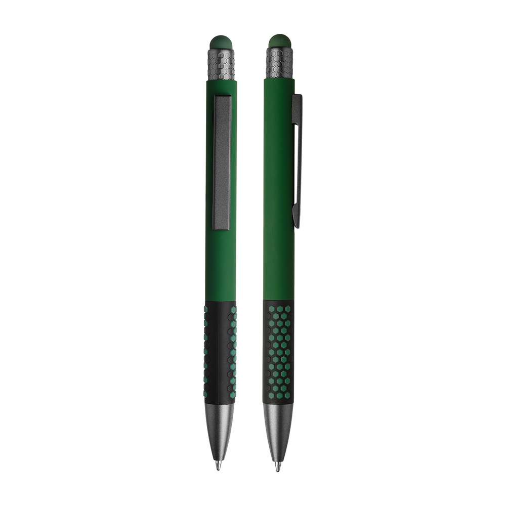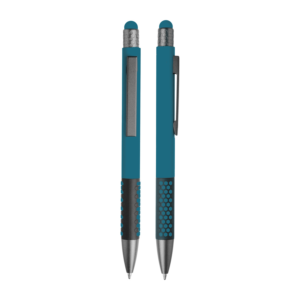 Caneta esferográfica em metal escrita em azul. Refil tipo parker, ponta touch emborrachada.