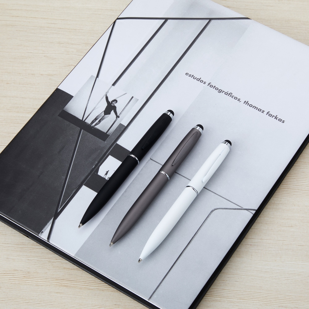 Caneta metálica touchscreen com acionamento por rotação e carga esferográfica azul 1mm.