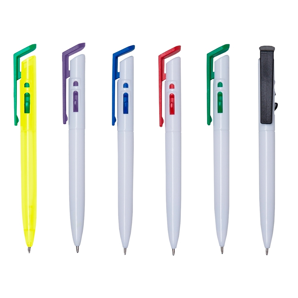 Caneta plástica com carga esferográfica azul 1.0 mm e acionamento por clique.