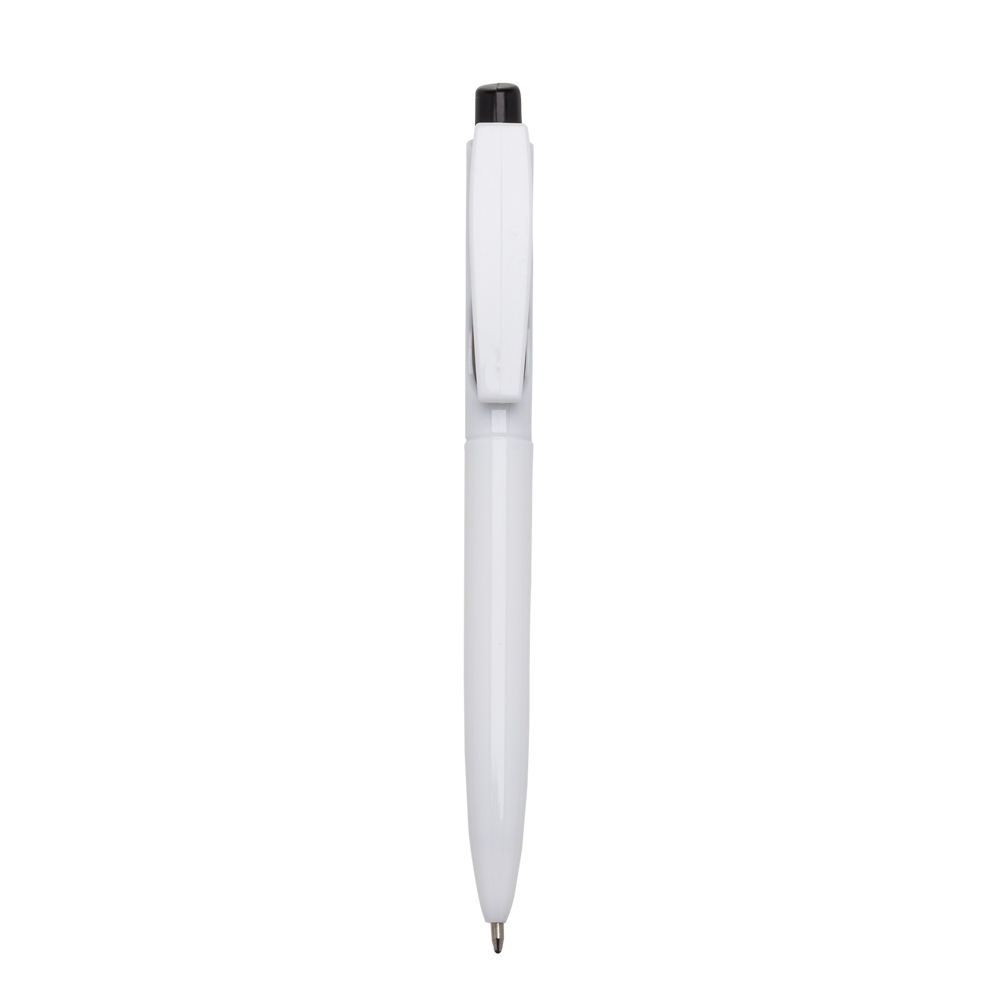 Caneta plástica com carga esferográfica azul 1.0 mm e acionamento por clique.