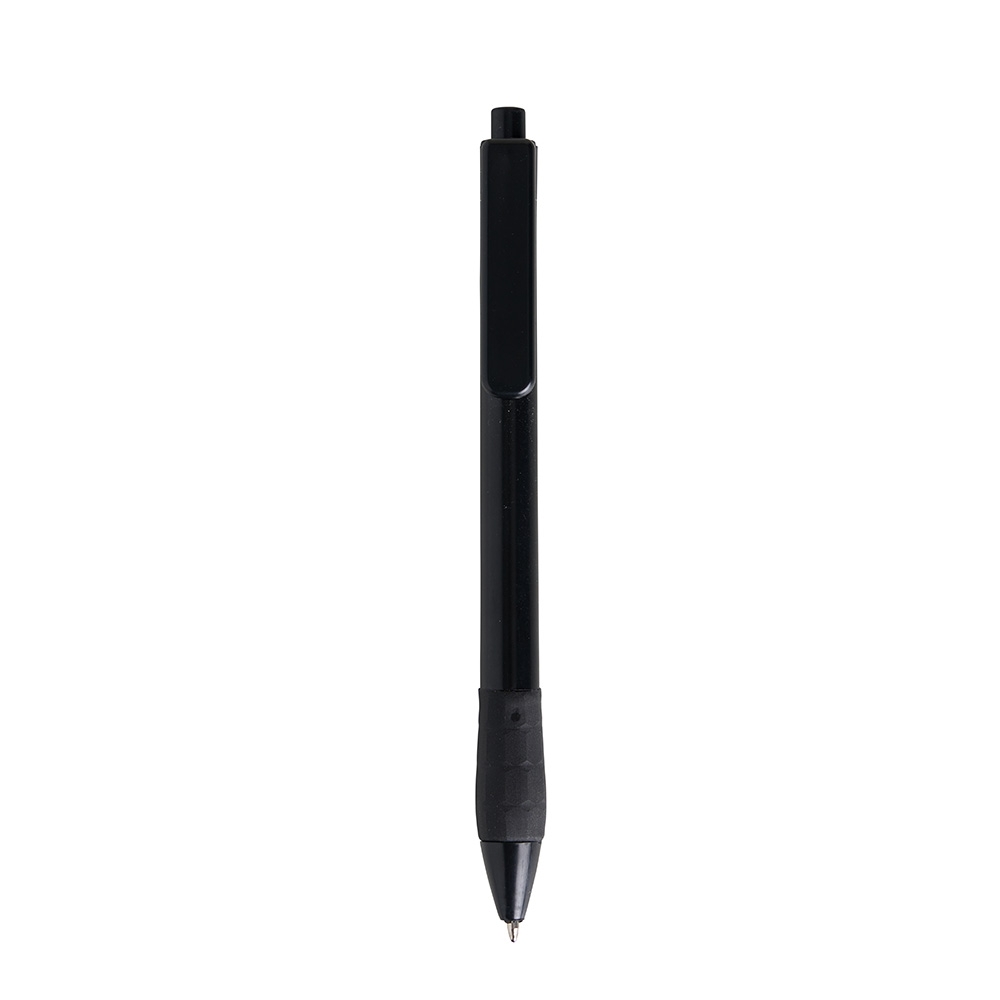 Caneta plástica com detalhe emborrachado, carga esferográfica azul e acionamento por clique.