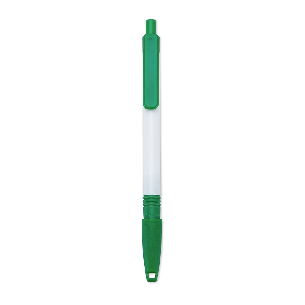 Caneta plástica com carga esferográfica azul e acionamento por clique. Acompanha cordão de poliéster com tampa para encaixe da caneta.
