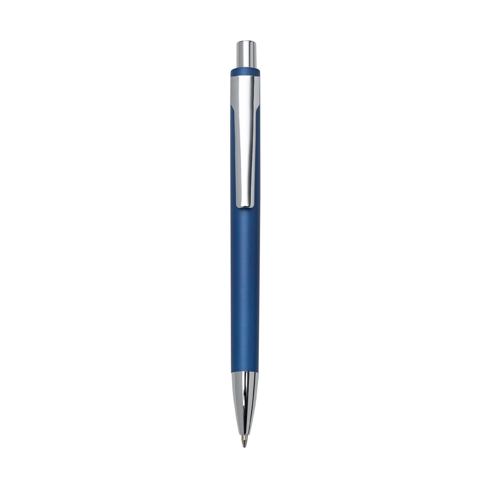 Caneta semimetálica com carga esferográfica azul e acionamento por clique.