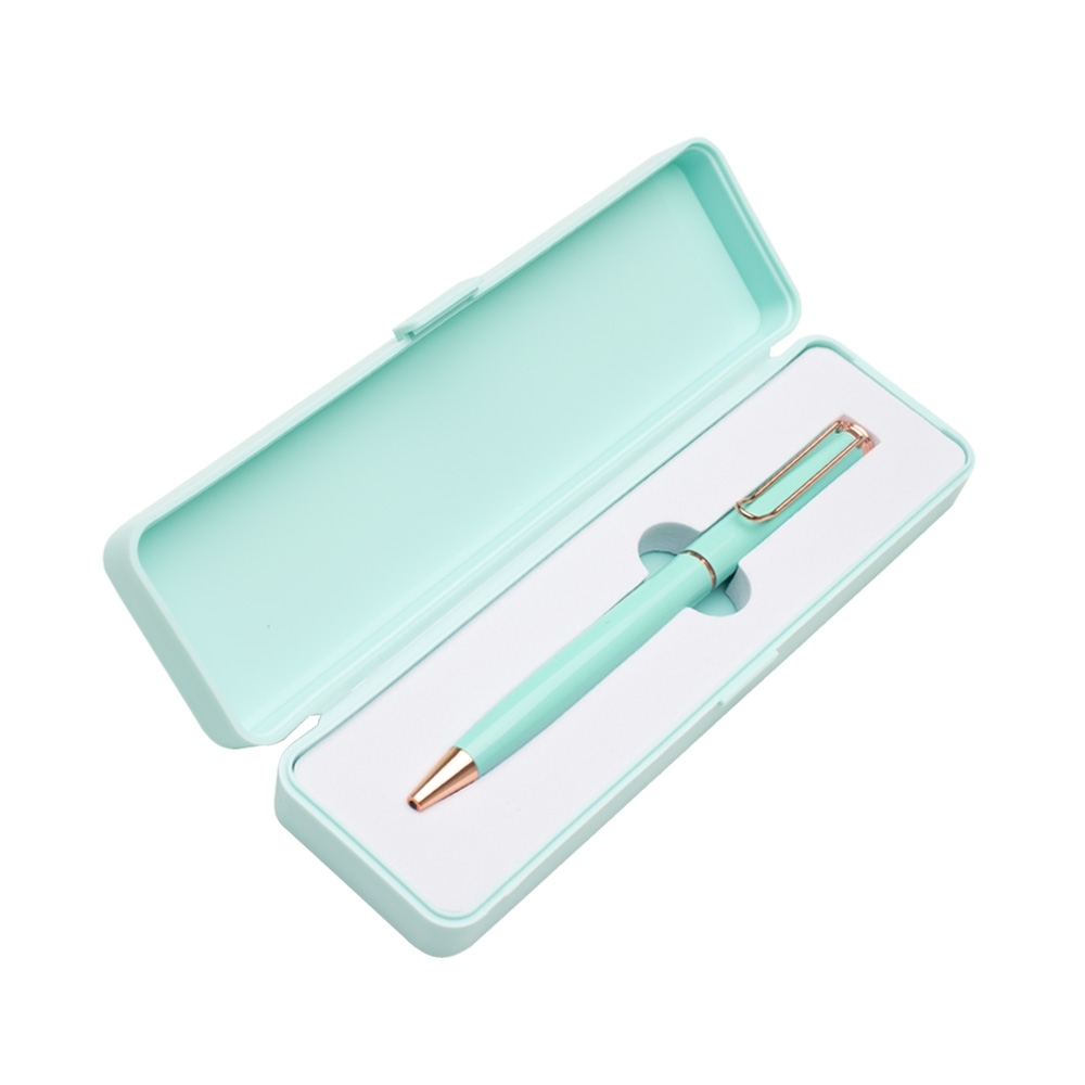 Conjunto caneta metálica com estojo de plástico e berço espumado. Carga esferográfica