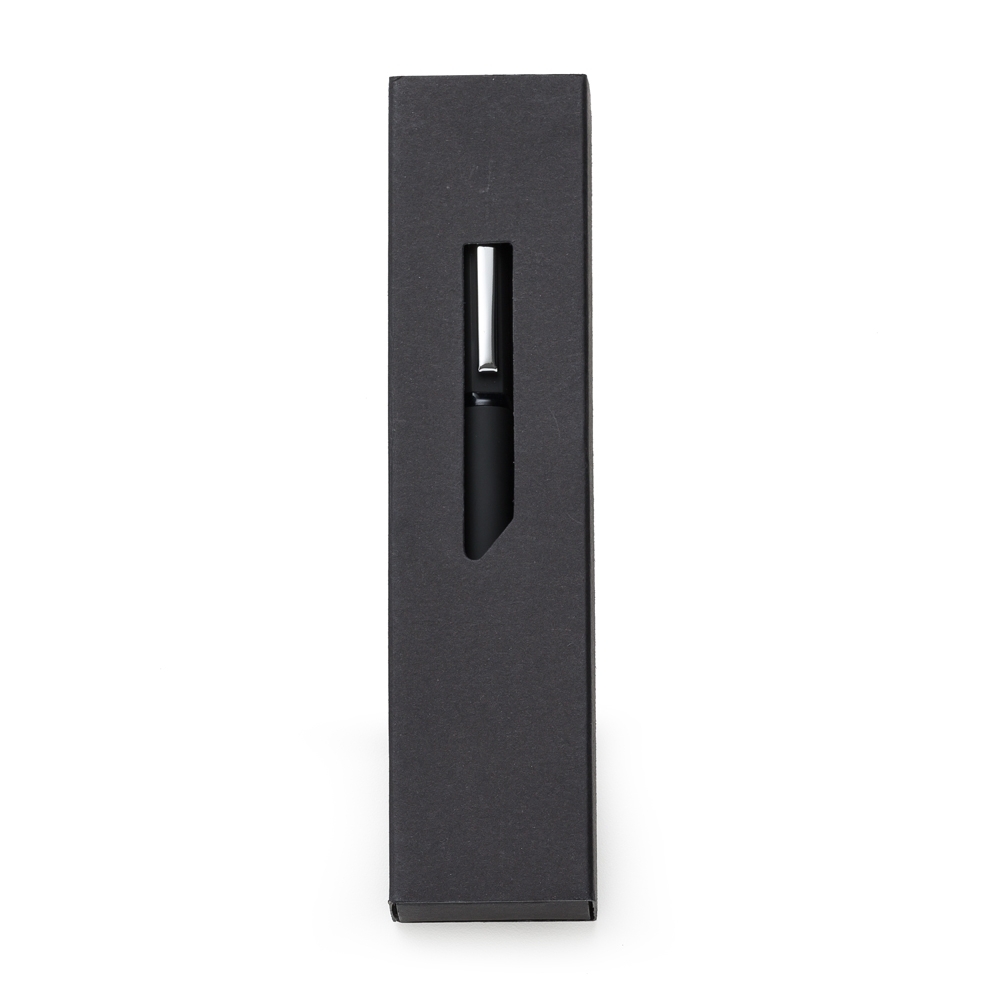 Caneta metálica com embalagem ecológica(papelão). Carga esferográfica azul. Acionamento por rotação.