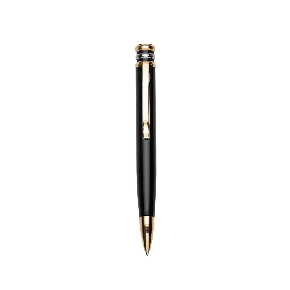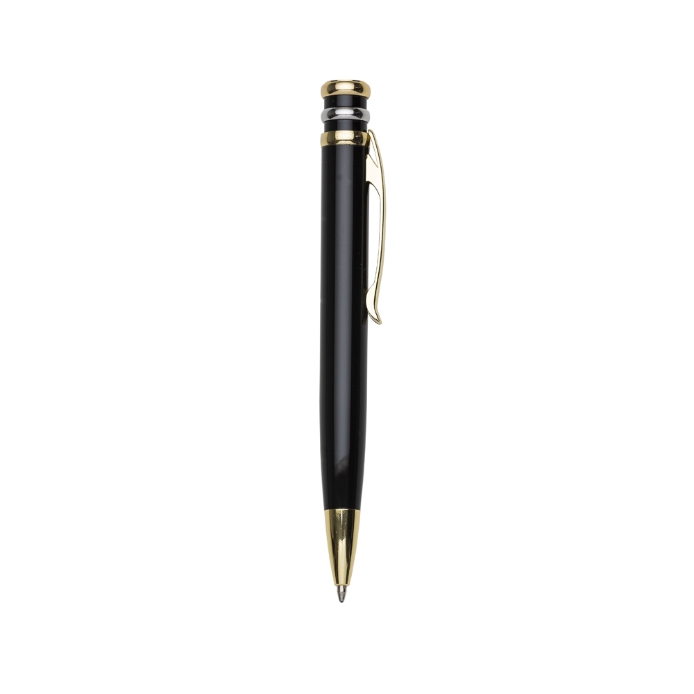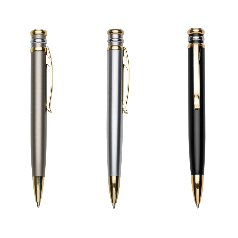 Caneta metal inteira colorida com detalhes dourado. Clip metal dourado com 3 anéis, sendo dois dourados e o central prata.Ponteira dourada, aciona por giro. OBS.: PEDIDO APENAS MÚLTIPLO DE 15 PEÇAS!