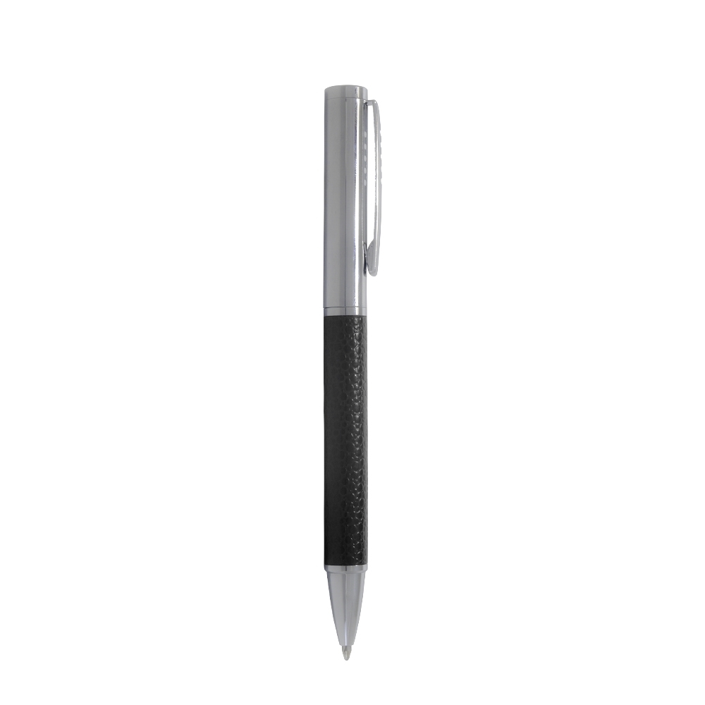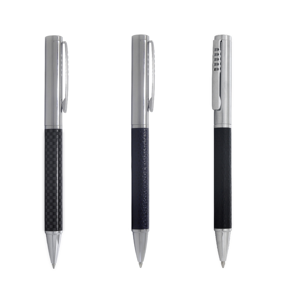 Caneta metálica com carga esferográfica azul e acionamento por rotação.