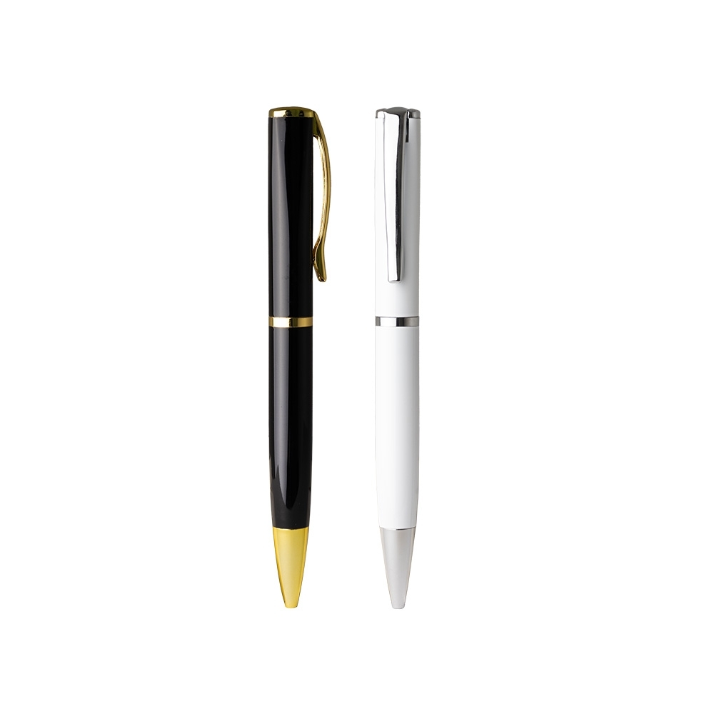 Caneta metálica com carga esferográfica azul 1.0mm e acionamento por rotação.