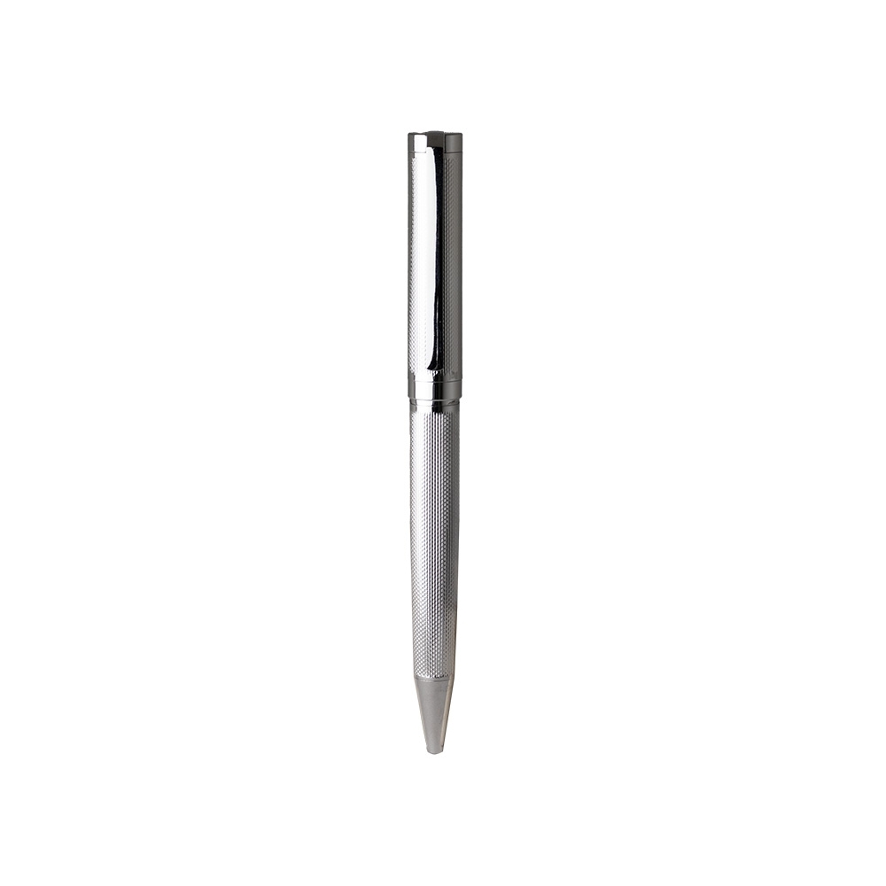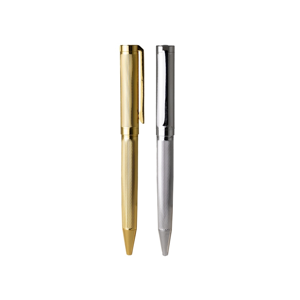 Caneta metálica com carga esferográfica azul 1.0mm e acionamento por rotação.