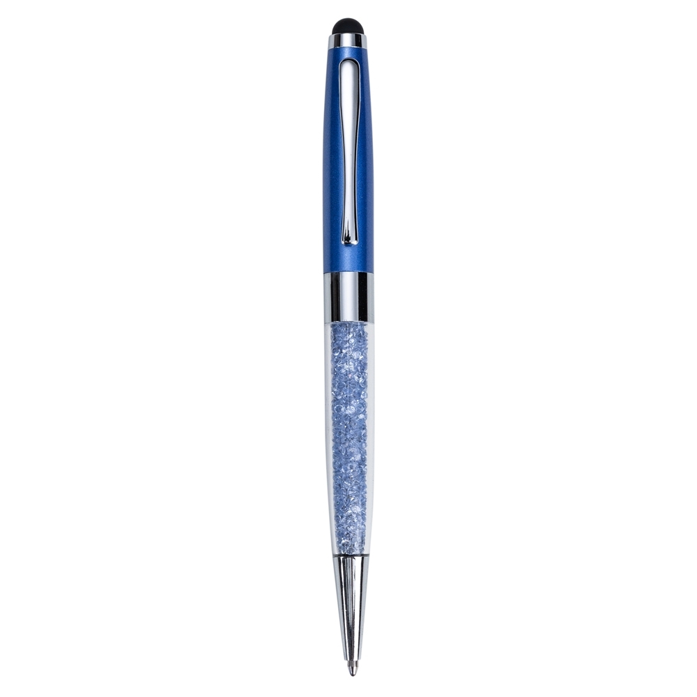 Caneta metálica com touch screen e detalhes em cristal, carga esferográfica azul e acionamento por rotação. OBS.: PEDIDO APENAS MÚLTIPLO DE 50 PEÇAS!