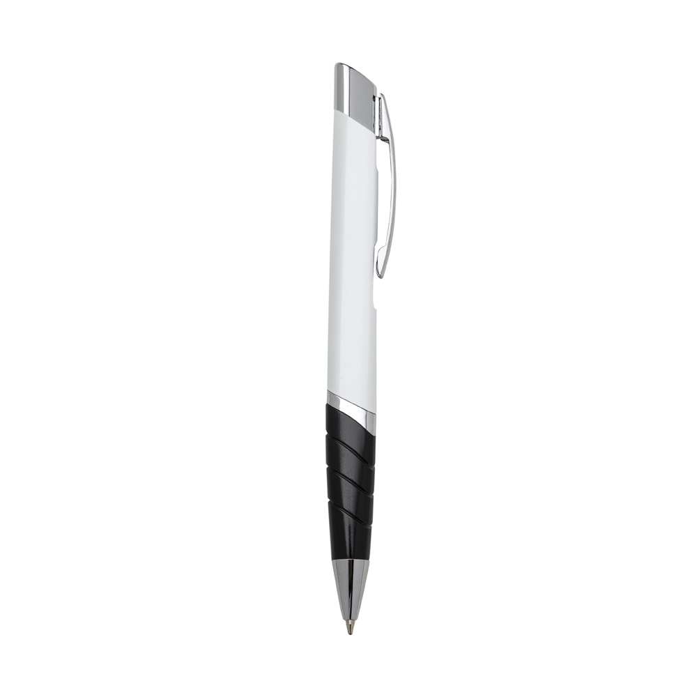 Caneta metálica triangular com carga esferográfica azul e acionamento por clique.