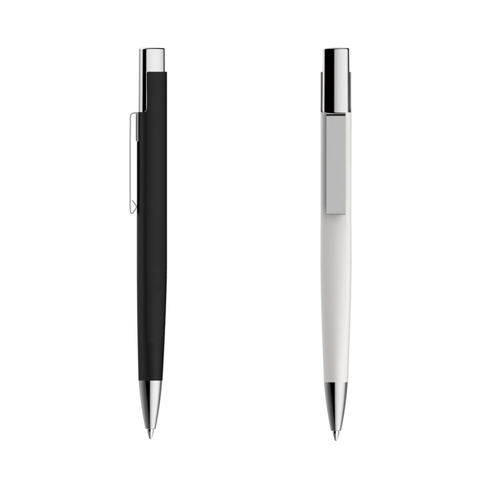 Caneta metal triangular de pintura fosca e detalhes em prata. Clip metálico espelhado, aciona por clique.
