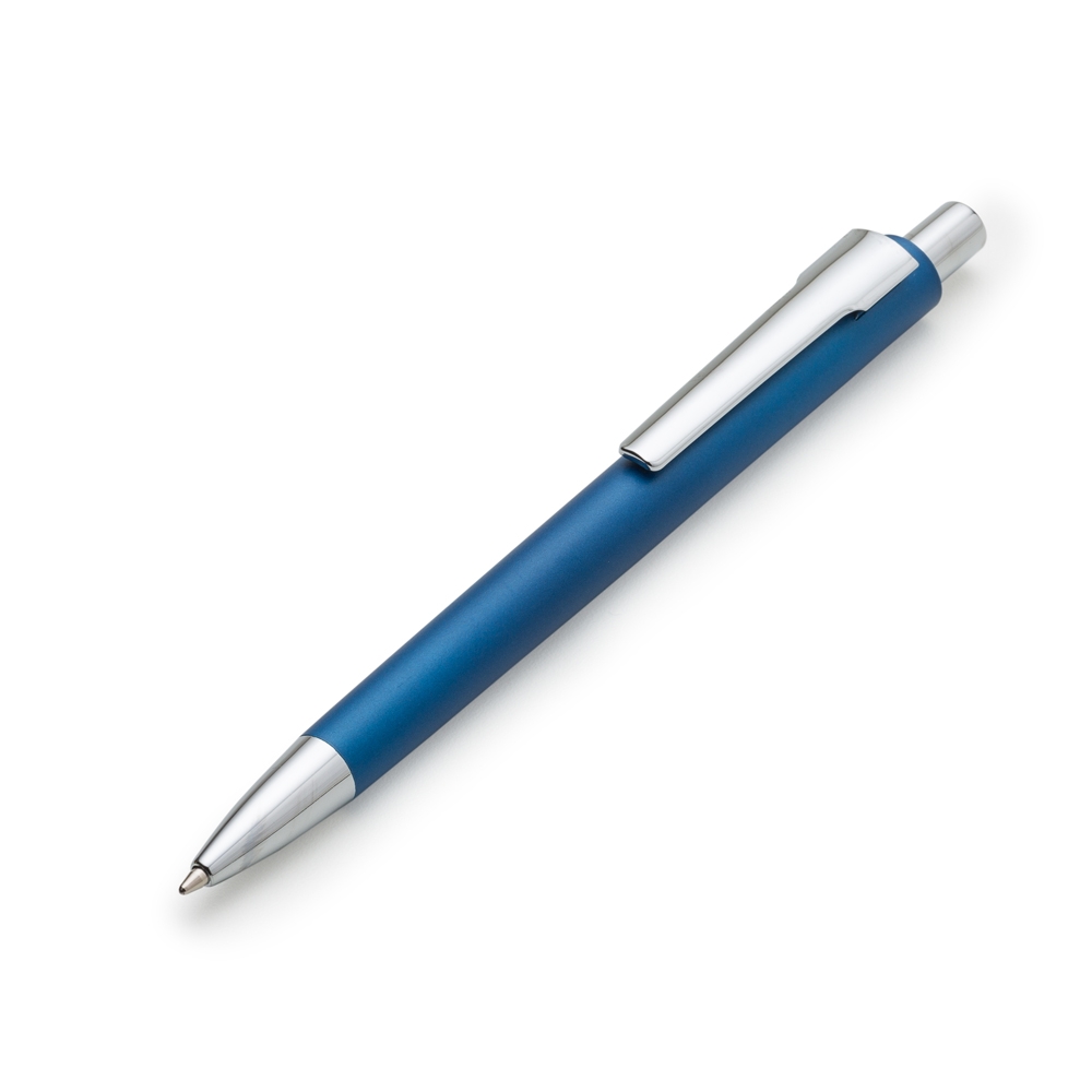 Caneta semimetálica com carga esferográfica azul e acionamento por clique.