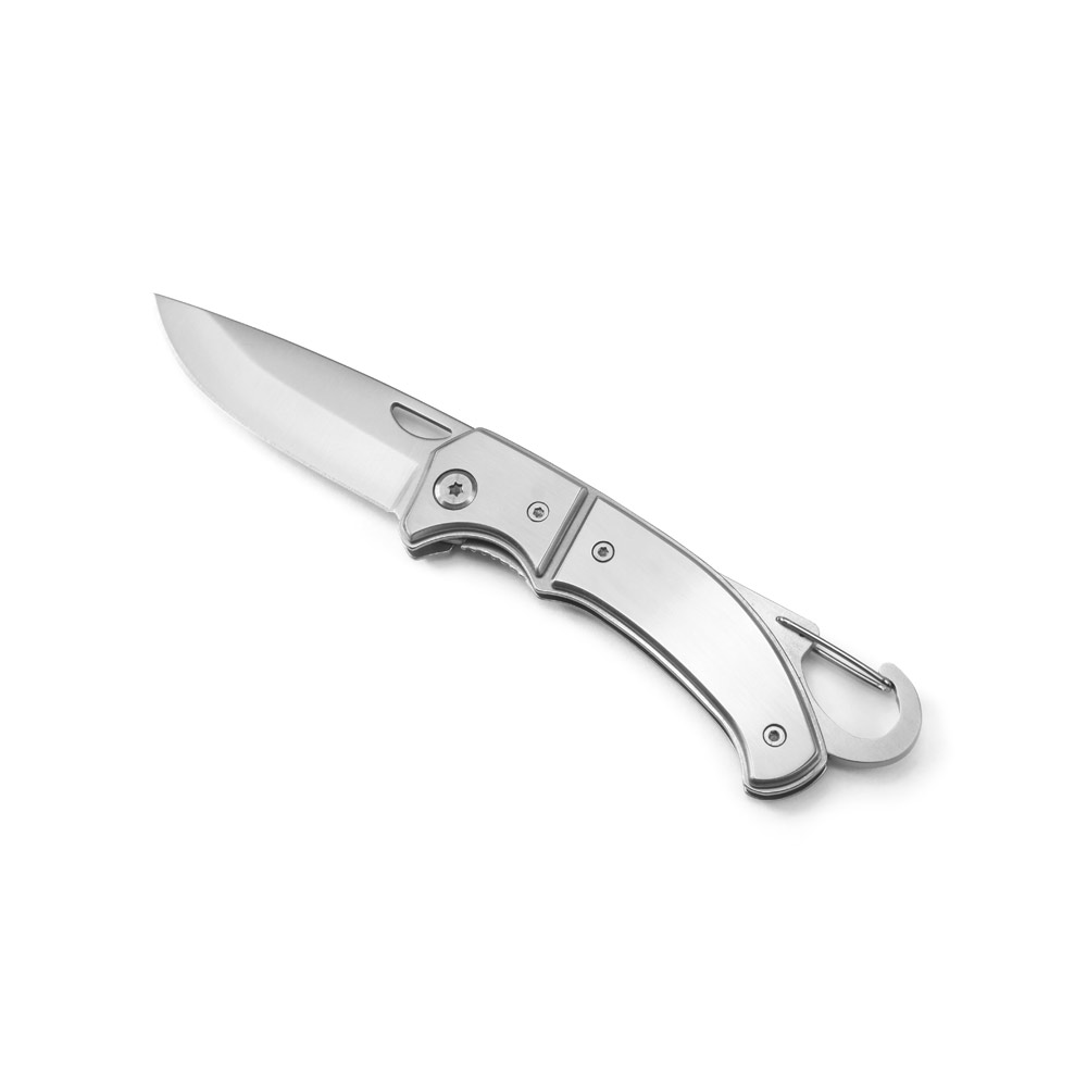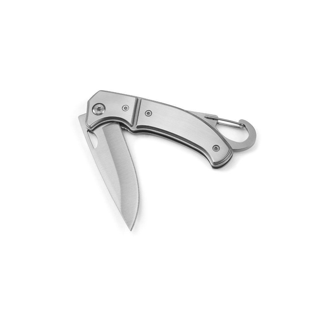 Canivete em aço inox e metal com fecho de segurança e clipe. Fornecido em caixa presente. 97 x 15 x 29mm | Caixa: 110 x 37 x 20 mm