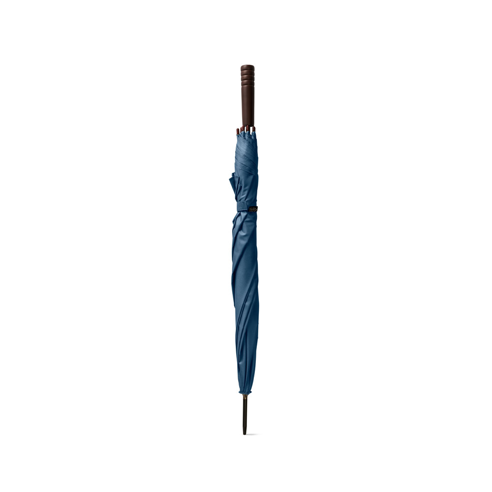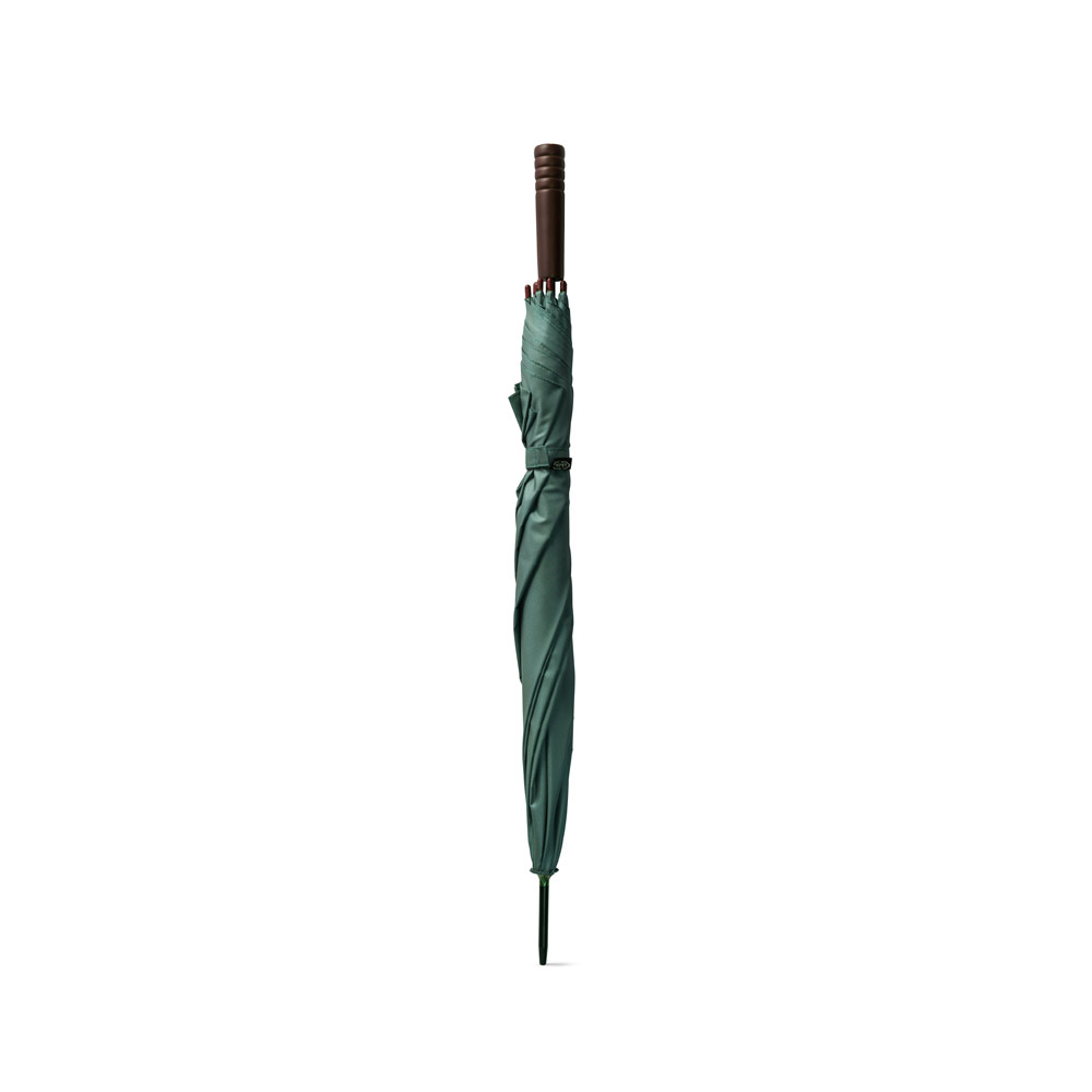Guarda-chuva em poliéster 100% reciclado pongee 190T, com haste e estrura em metal e pega em madeira. O guarda-chuva tem abertura automática