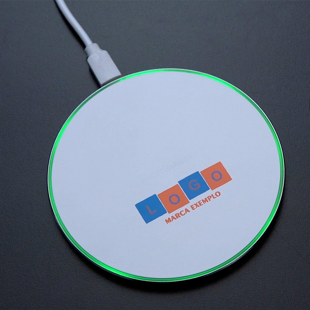 Carregador rápido por indução feito em plástico com base antiderrapante em silicone. Compatível com smartphones com tecnologia Qi, conta com entrada Micro USB para alimentação, além de iluminação RGB nas bordas. Acompanha cabo Micro USB.