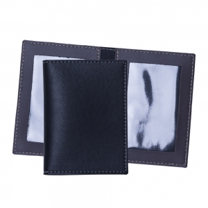 Porta documento em couro sintético: Frente e verso liso. Parte interna com dois bolsos de visor plástico.