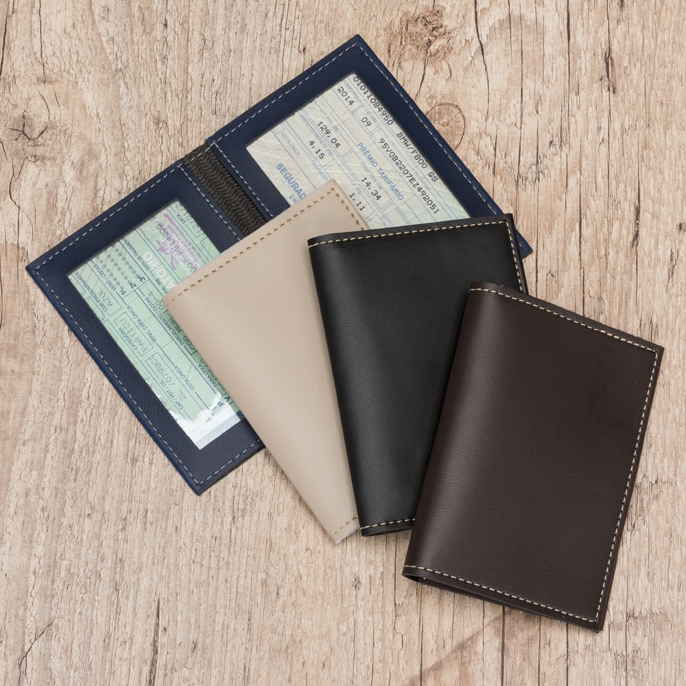 Porta documento: Em couro sintético, parte interna revestida de veludo e dois “bolsos” com visor plástico.