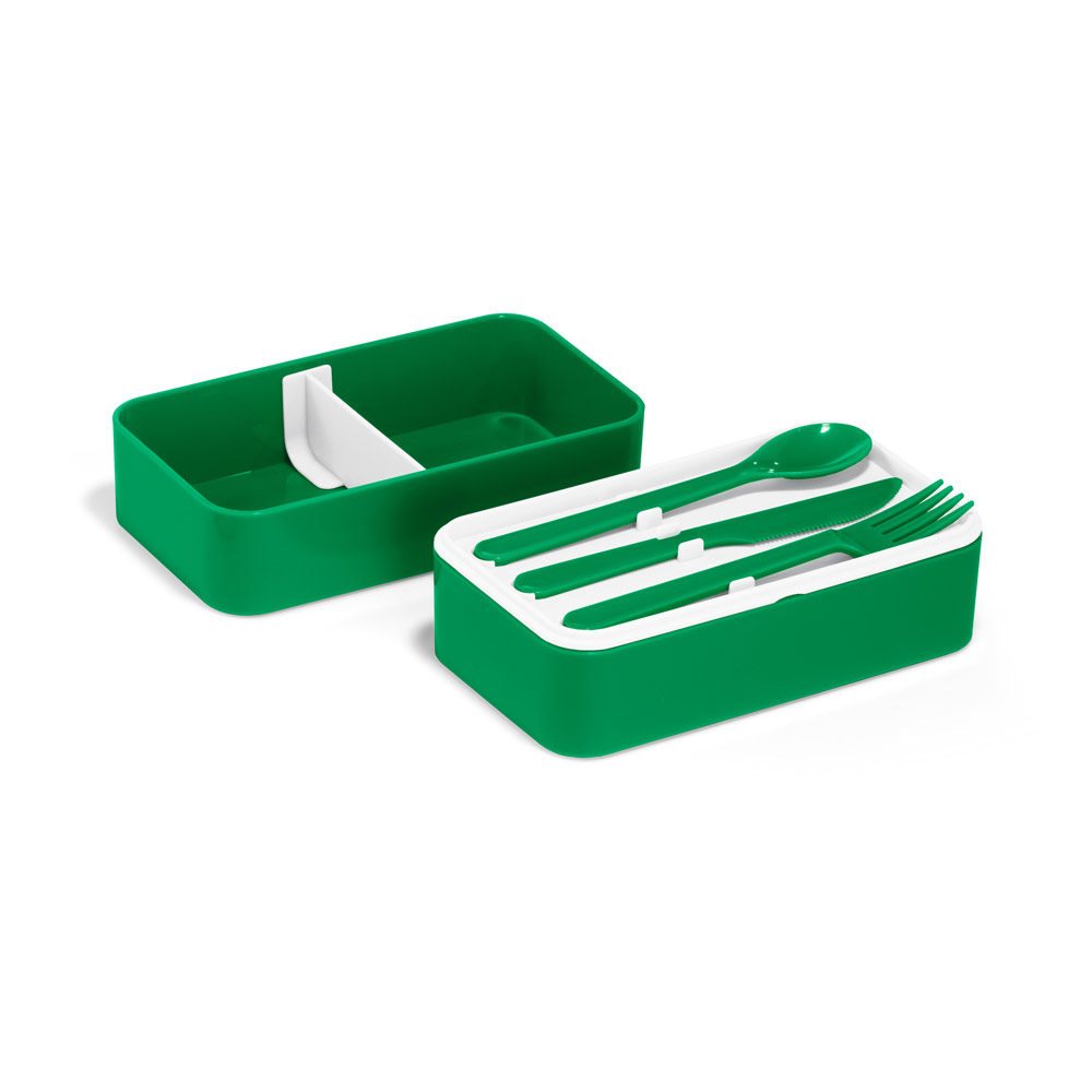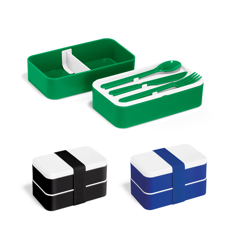 Marmita em PP e PS com 2 compartimentos (680 mL cada) e 1 divisória removível. Incluso 3 talheres: garfo, faca e colher. Fecha com banda elástica e está apta para micro-ondas, retirando a tampa. Caixa branca 93852 vendida opcionalmente. Certificação EU Food Grade. 180 x 100 x 100 mm