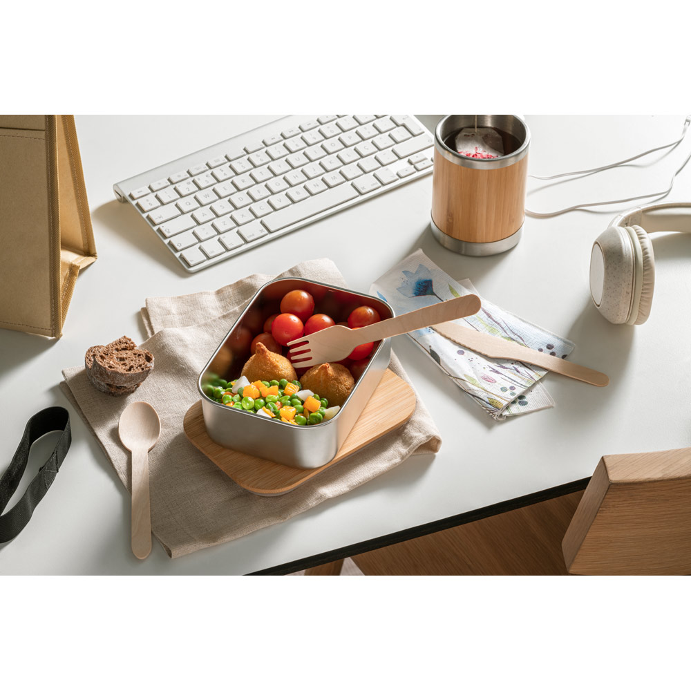 Marmita em aço inox e tampa em bambu com banda elástica para um transporte mais seguro. Capacidade até 800 mL. Fornecida em caixa presente de papel kraft reciclado. Certificação EU Food Grade. A cor e o resultado da impressão nos materiais naturais pode variar entre produtos. 165 x 115 x 52 mm