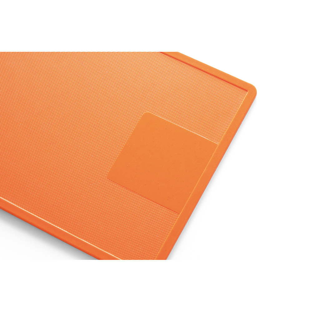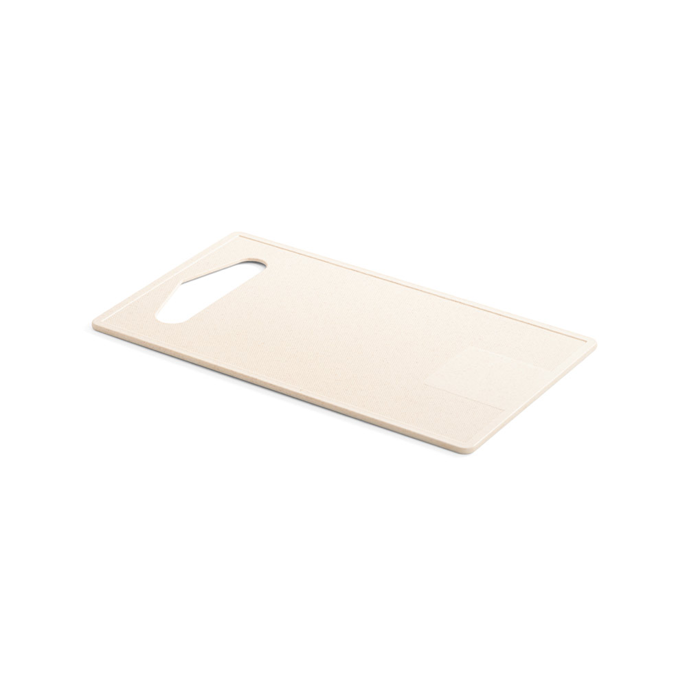 Tábua de corte em fibra de bambu (50%) e PP (50%). Contém um quadrado liso no fundo da tábua, adequado para a personalização. Certificação EU Food Grade