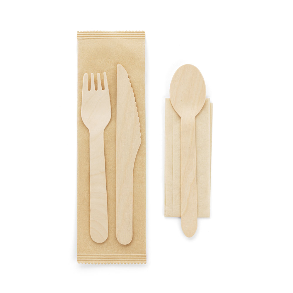 Conjunto de talheres descartáveis em madeira composto por: garfo, faca e colher. Incluso guardanapo em kraft. Fornecido em bolsa de papel kraft
