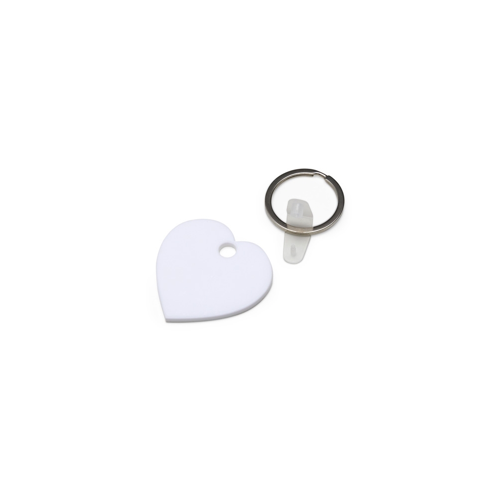 Chaveiro de acrílico em formato de coração, frente verso e liso. Possui prendedor de plástico que conecta a argola metálica.