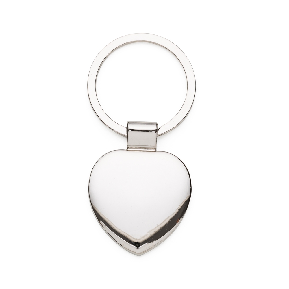 Chaveiro de metal formato coração, possui chapa central em inox e verso brilhante liso.