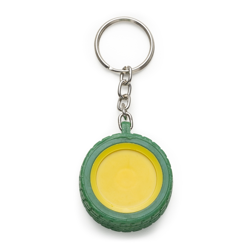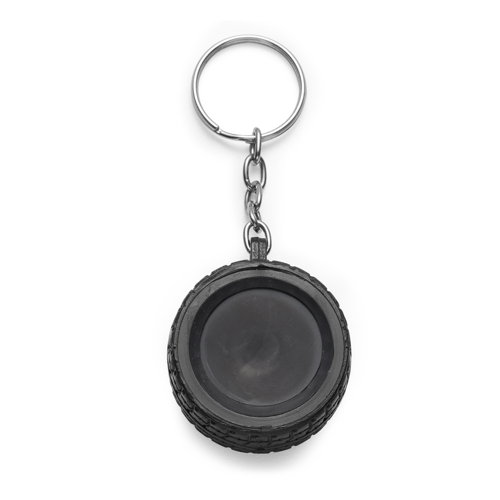 Chaveiro plástico formato pneu, aro detalhado plástico colorido de um lado e lado inverso liso(possível aplicar resina). Pneu emborrachado.