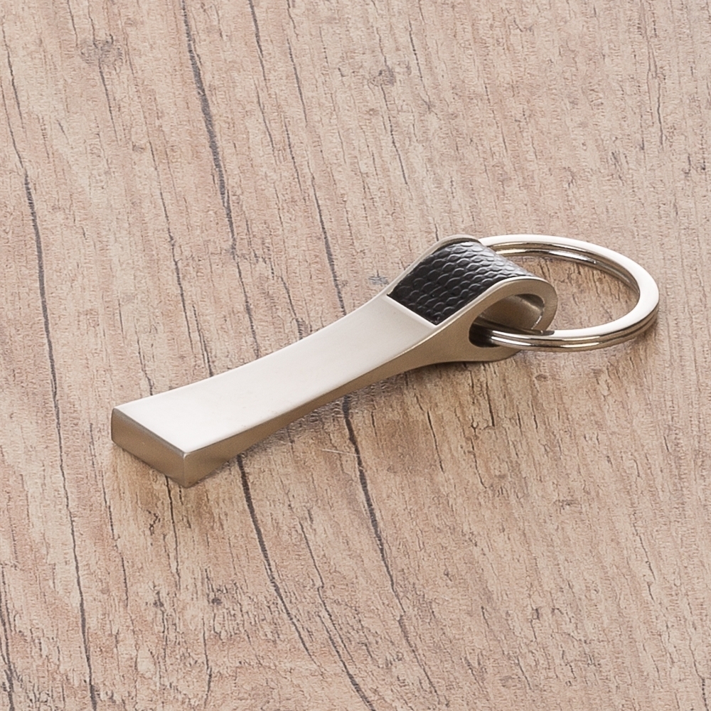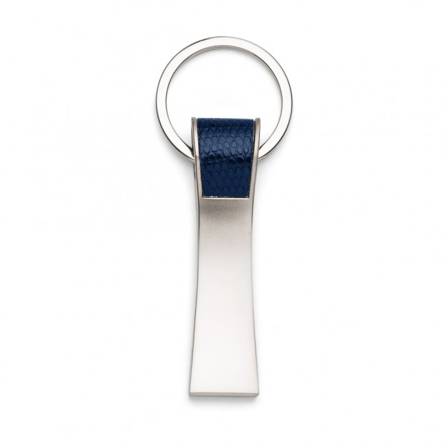 Chaveiro de metal fosco com detalhe em couro sintético texturizado. Frente e verso liso.