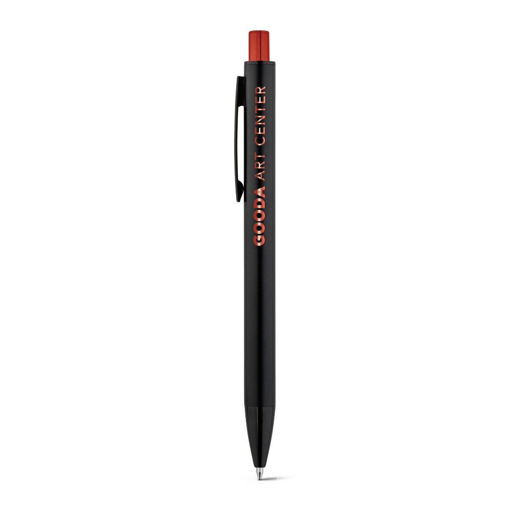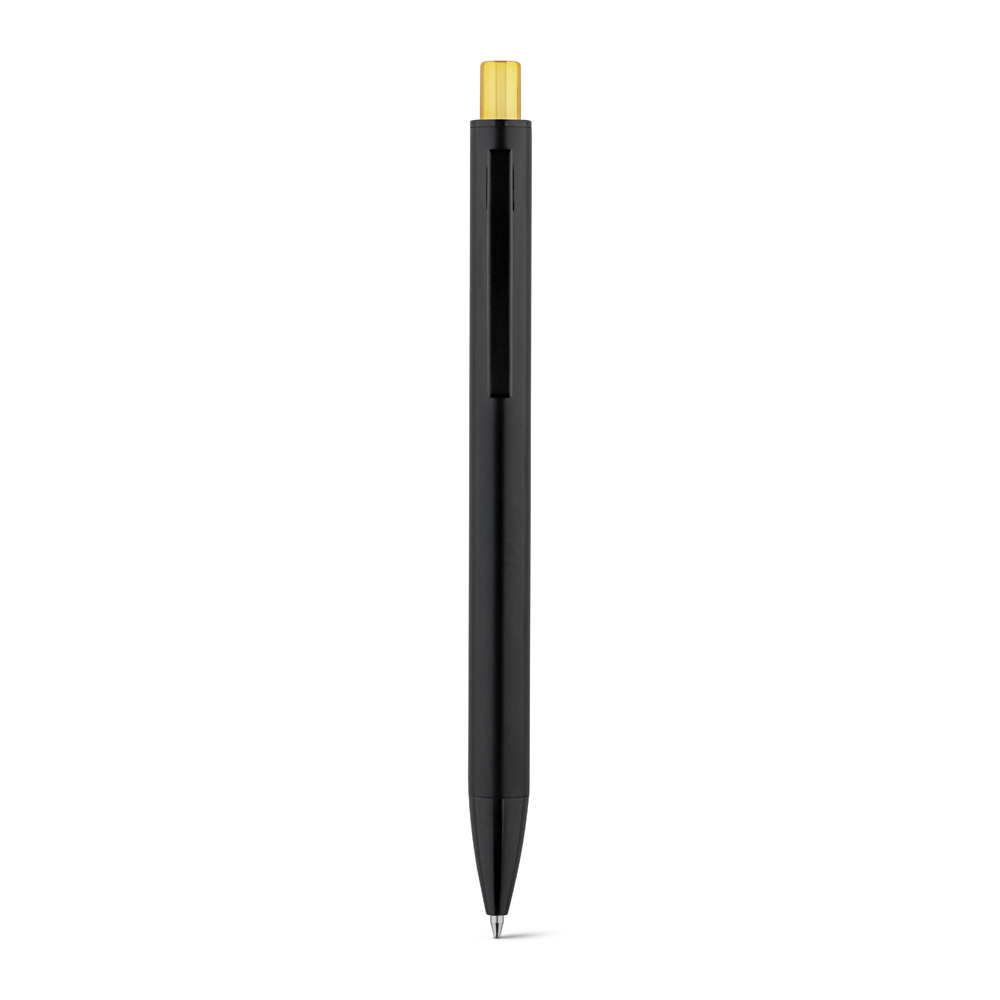 Esferográfica em alumínio com acabamento mate, botão com acabamento brilhante e clipe de metal. Corpo com duplo acabamento. Escrita em azul. ø10 x 140 mm