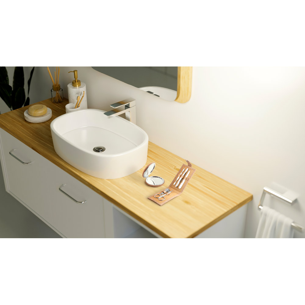Conjunto de manicure em cortiça com cinco peças em aço inoxidável: lixa, tesoura, cortador de unhas, pinça e empurra cutículas. Fornecido em bolsa de papel natural. 104 x 61 x 17 mm