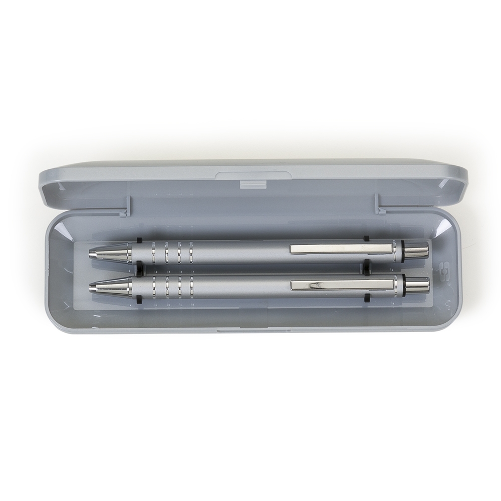 [vc_row][vc_column width=”2/3″]n[vc_column_text]Conjunto caneta e lapiseira semimetal e estojo plástico resistente. Estojo não é plano(apenas a parte central), caneta e lapiseira semi-metálicas inteiras coloridas com detalhes prata(acionadas por clique), clip de metal com anel e parte inferior com 4 anéis. OBS.: PEDIDO APENAS MÚLTIPLO DE 50 PEÇAS! n n n n n n Medidas aproximadas para gravação (CxL): Estojo 2,8 cm x 4,3 cm – Caneta/Lapiseira 4 cm x 0,7 cmn Tamanho total aproximado (CxL): Estojo 16,5 cm x 5cm – Caneta/Lapiseira 13,5 cm x 1,2 cmn Peso aproximado (g): 62n