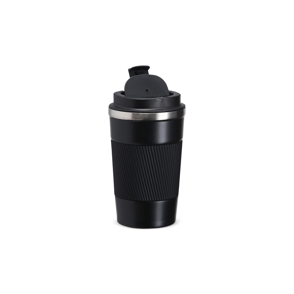 Copo térmico em inox 304 com pintura eletrostática, base antiderrapante e capacidade máxima de 350ml. Possui estrutura de parede dupla e vedação a vácuo, permitindo a conservação da temperatura de líquidos por mais tempo. Conta ainda com tampa rosqueável em plástico com trava protetora no bocal e luva removível em silicone.