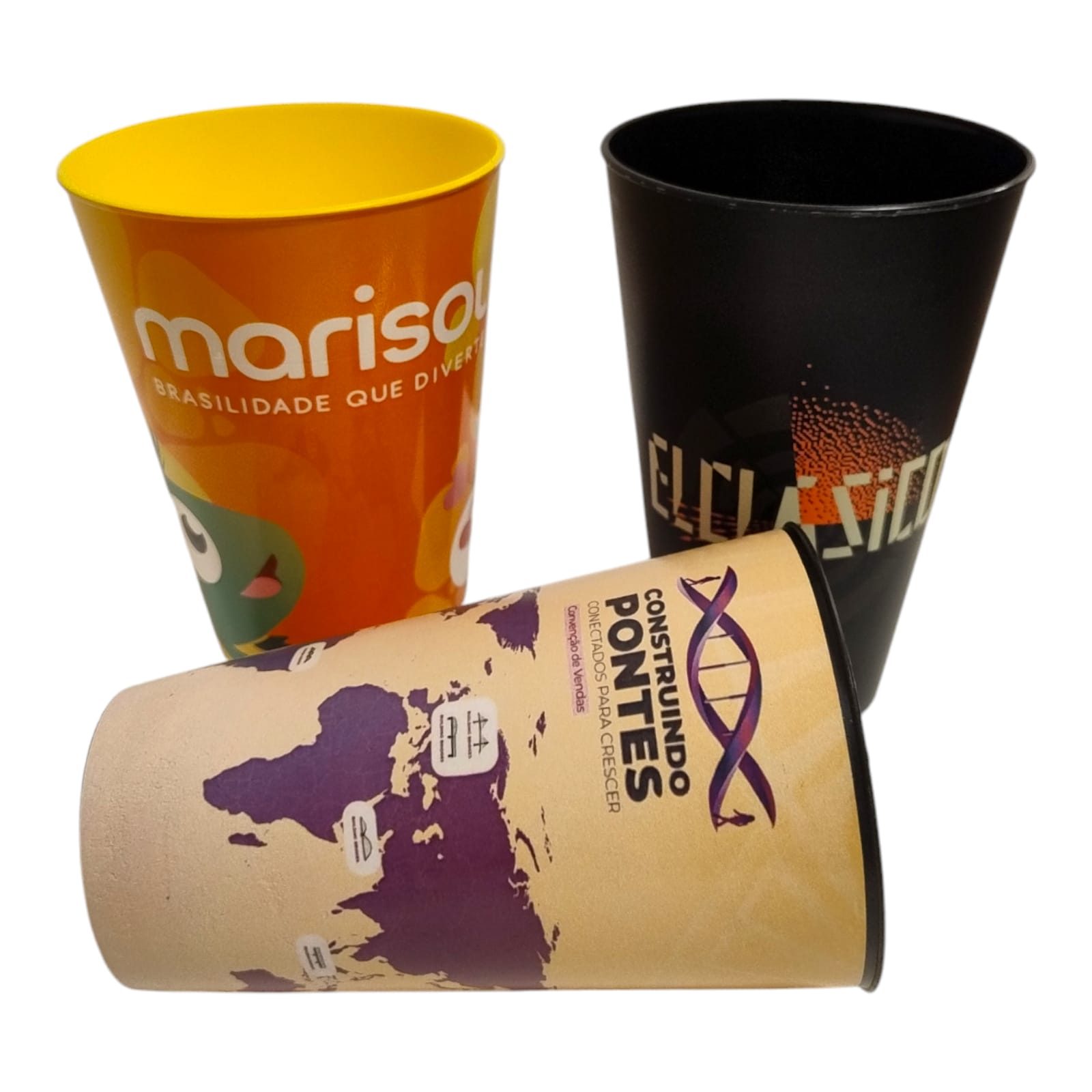 Copo de plástico personalizado in MOLD LABEL. Muito mais colorido e resistente esse tipo de personalização possibilita promover e divulgar sua marca em todo o copo, sem se preocupar com a quantidade de cores. É ideal para promover lançamentos de filmes, produtos e personagens