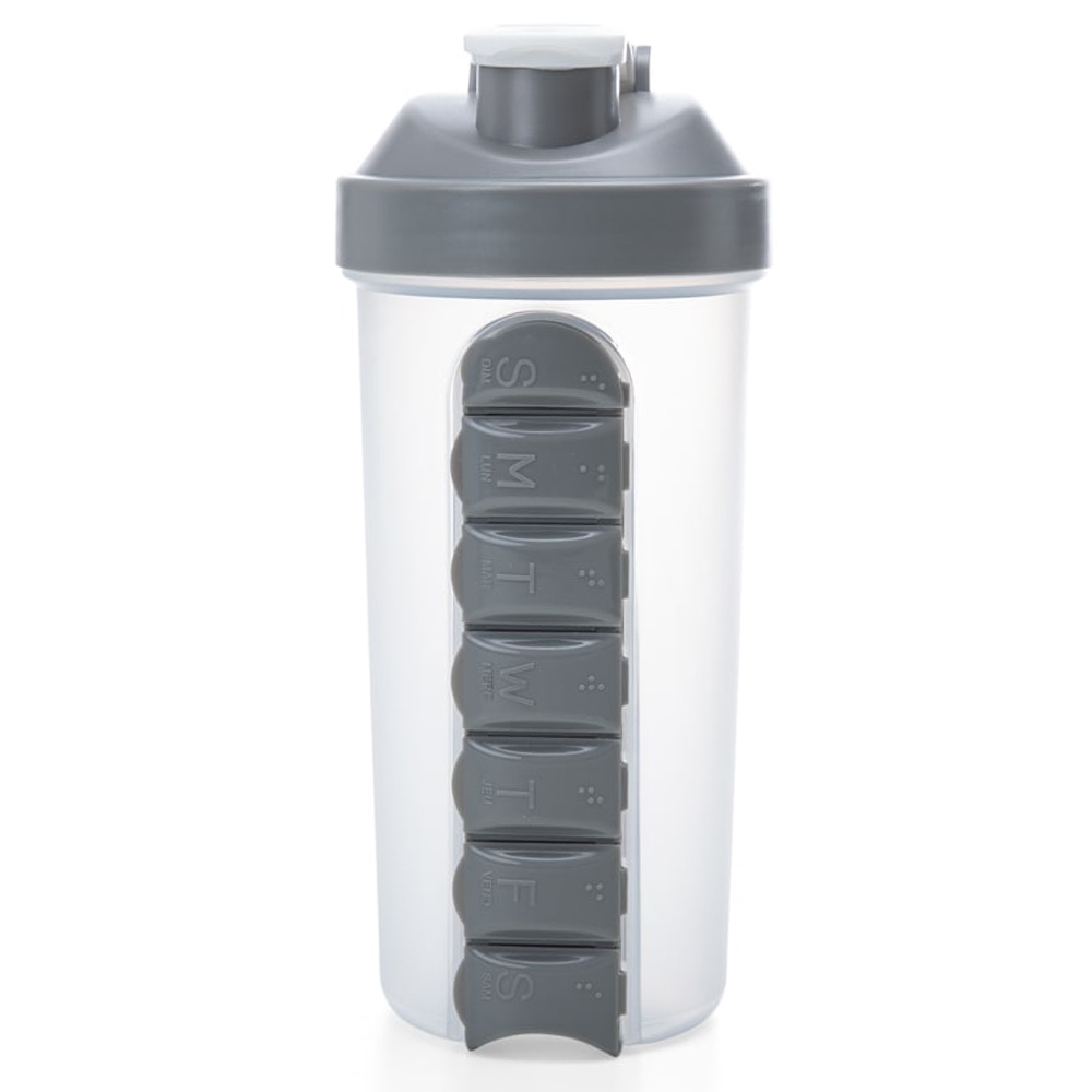 Coqueteleira plástica 750ml: Com porta comprimido. Copo transparente fosco com medição em ml e oz(600ml e 20oz), apesar do copo constar esta medição ele suporta até 750ml(ultrapassa a marcação); parte frontal com pequenas portas especificadas com os dias da semana em siglas inglês/francês, basta levantar/abrir à direita para a abertura de cada compartimento. Tampa de rosca com pequena alça regulável e tampa protetora para o bocal.