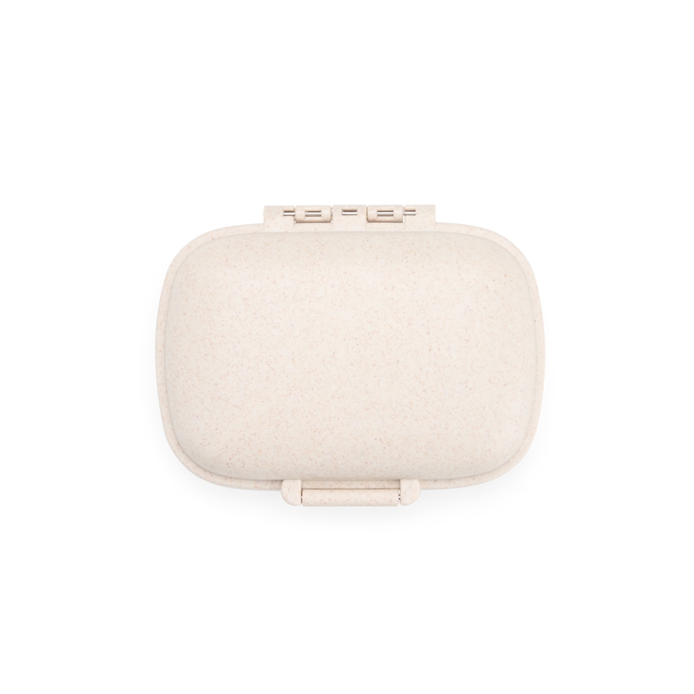 Porta-comprimidos compacto feito em plástico obtido da palha de trigo e anel de vedação para as bordas em silicone. Possui oito compartimentos com tampas removíveis, sendo dois maiores com capacidade de até 30ml e seis menores com até 10ml cada. Acompanha palheta multiuso.
