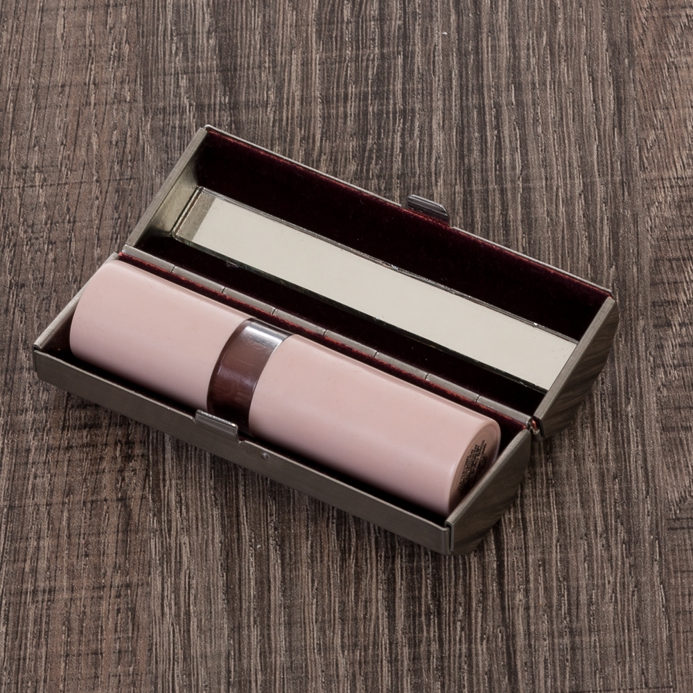 Porta batom metal: Com espelho e parte interna revestida de veludo.