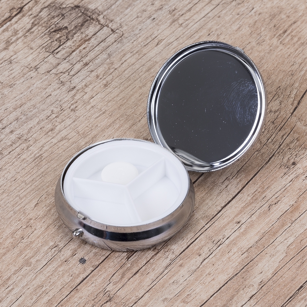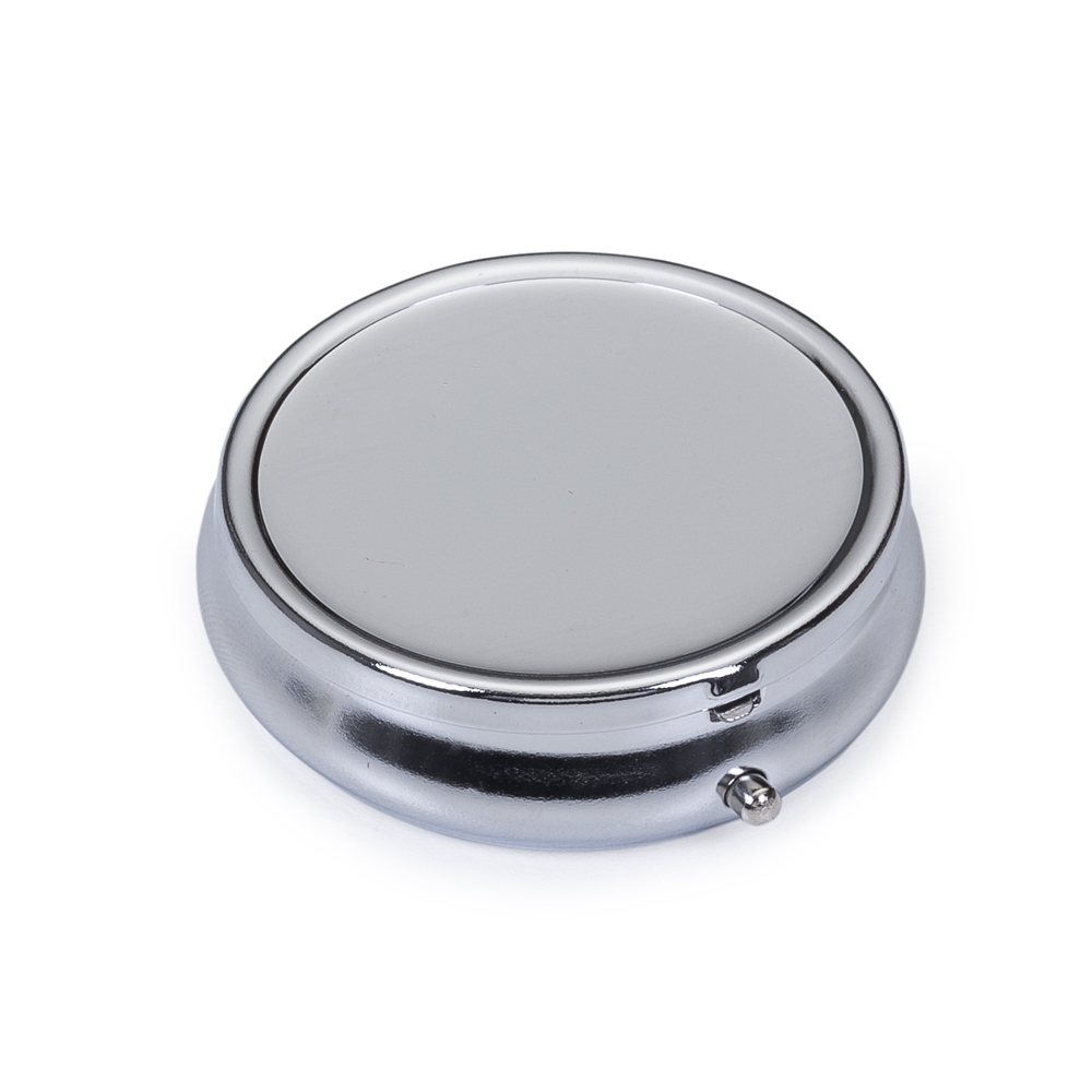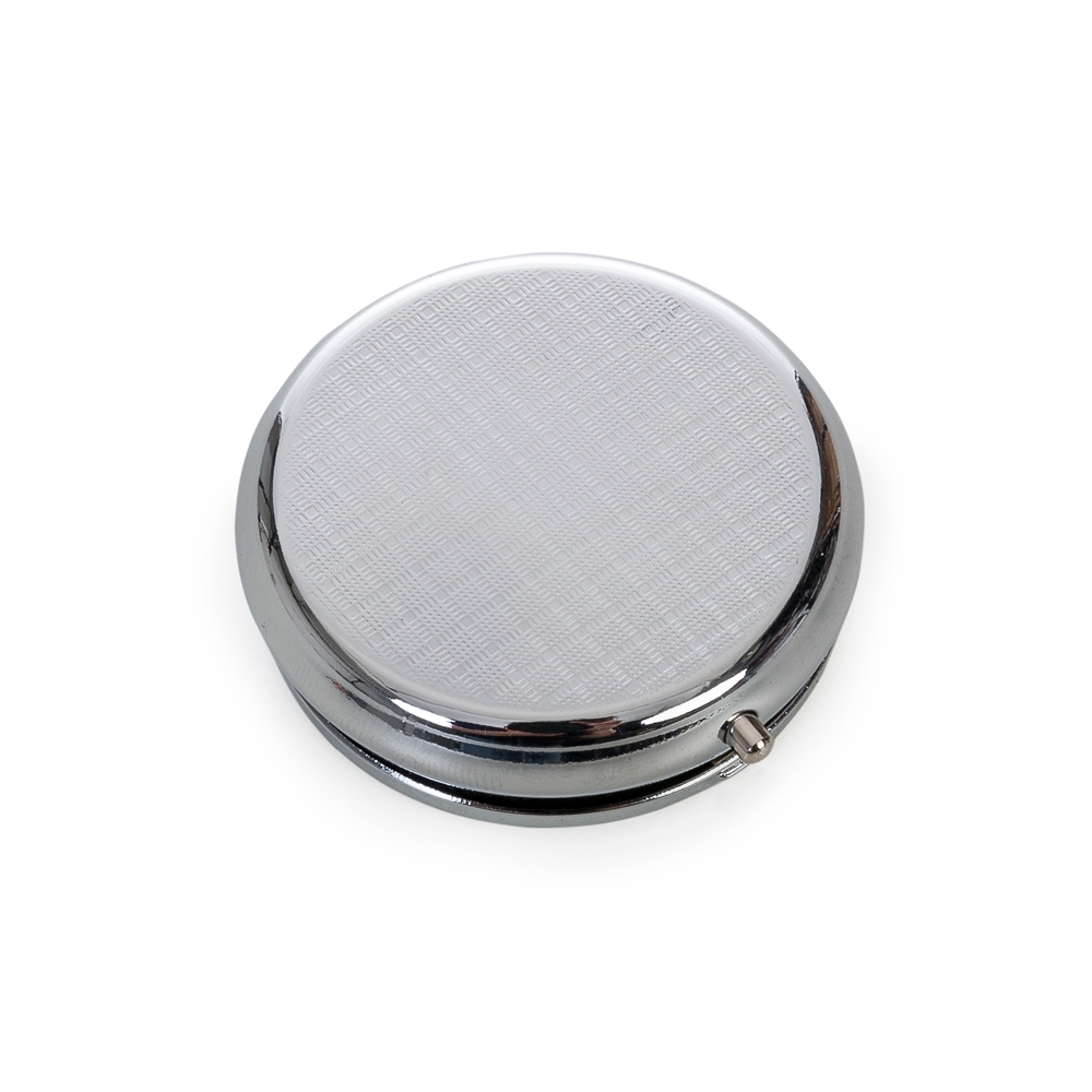 [vc_row][vc_column width=”2/3″]n[vc_column_text]Porta comprimido redondo de metal, parte superior(tampa) brilhante externo e interno e lado inferior com detalhes estilo mosaico. Parte interna com três divisórias plásticas, possui um botão para abrir. n n n n n n Medidas aproximadas para gravação (CxL): 3,9 cm x 3,9 cmn Tamanho total aproximado (CxL): 4,9 cm x 4,9 cmn Peso aproximado (g): 26n