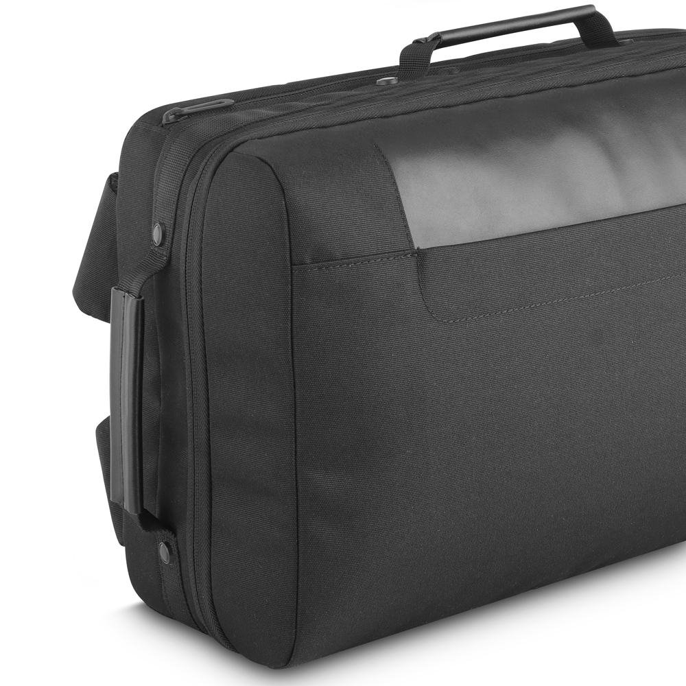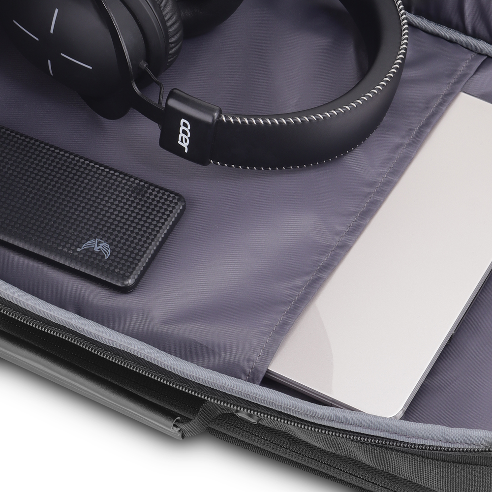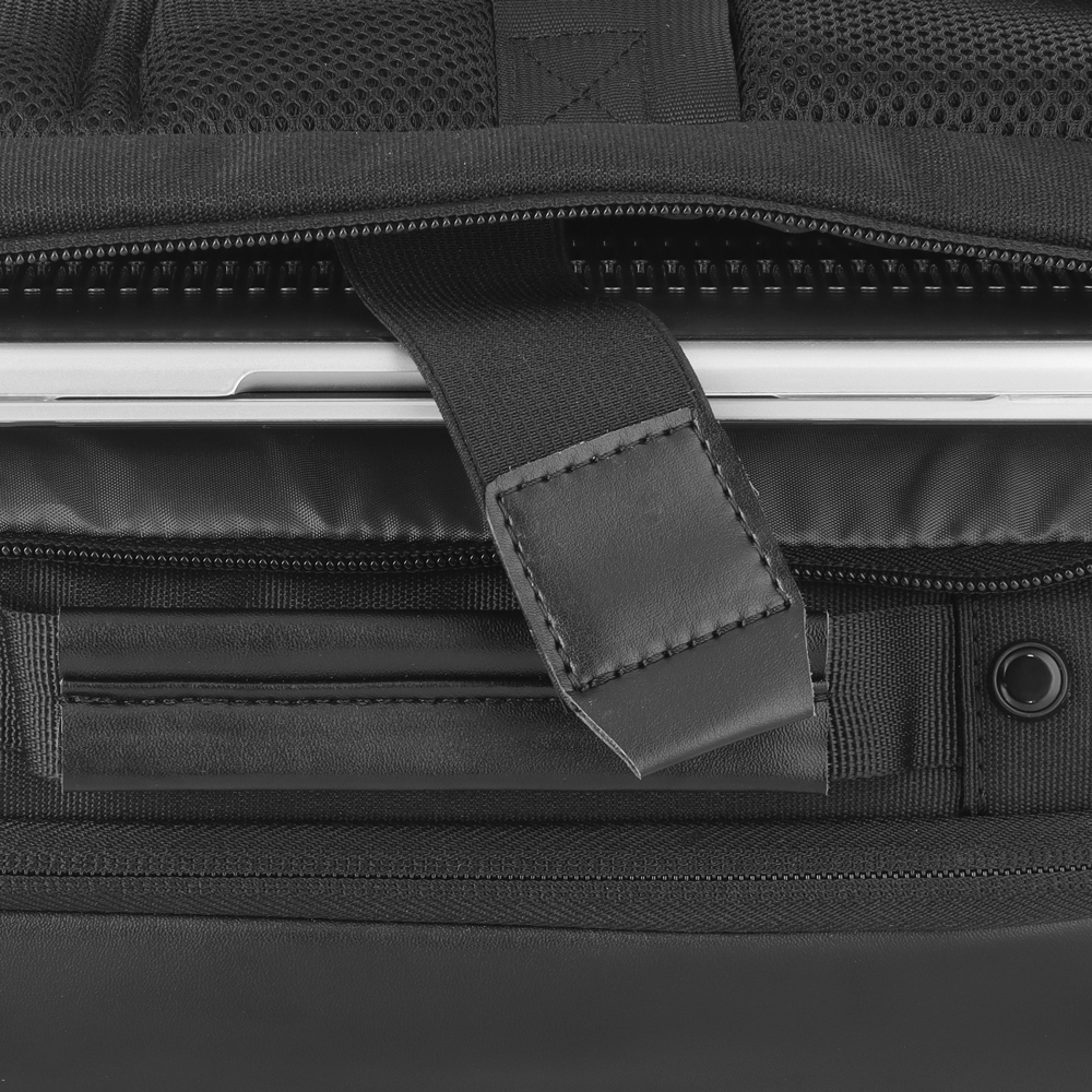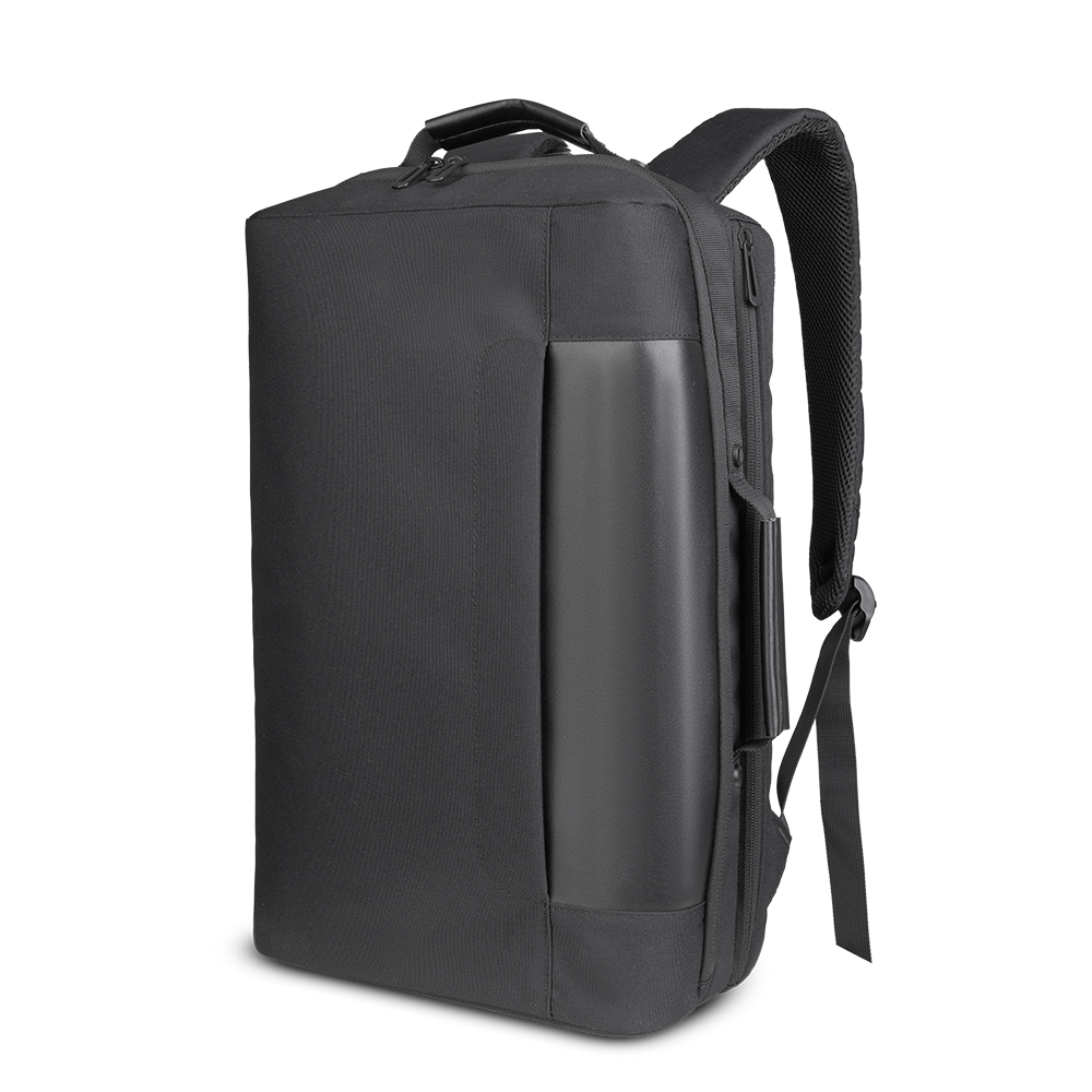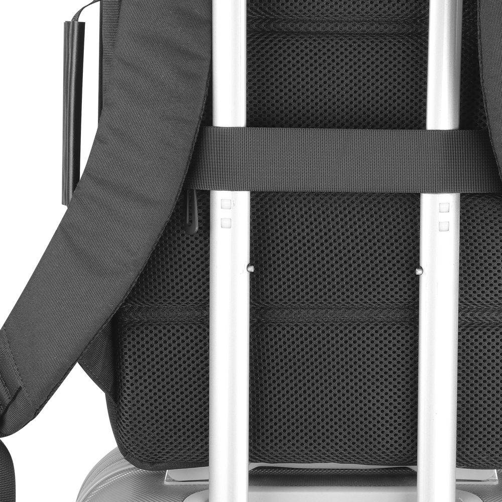 Mochila premium, produzida com poliéster 600D acolchoado e interior em 210D, alças de ombro acolchoadas, interior com divisórias, bolso frontal com zíper e na parte das costas uma divisória atrás do engate para mala de viagem, aceita notebook de até 15,6”.