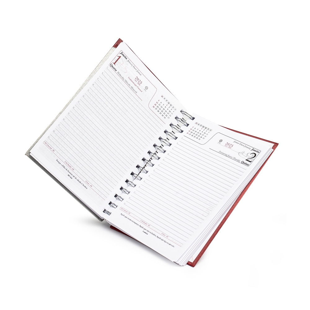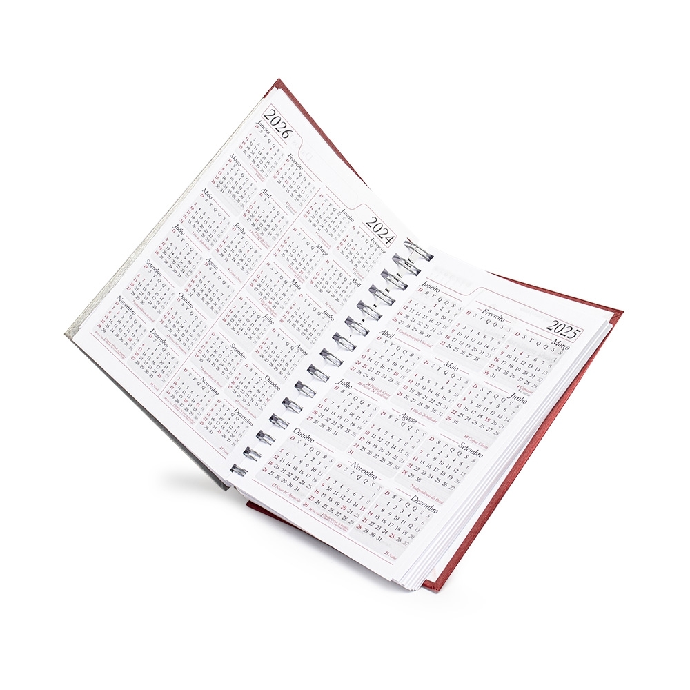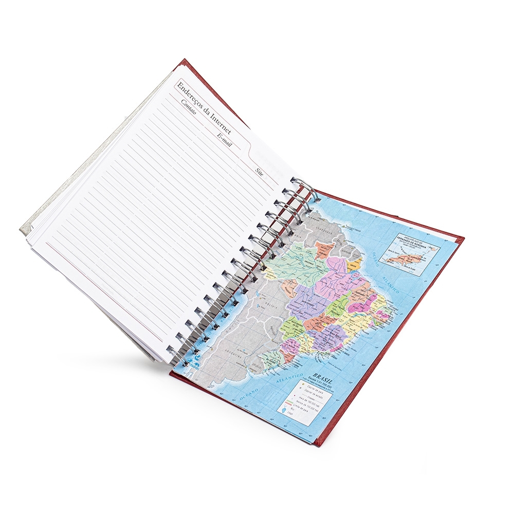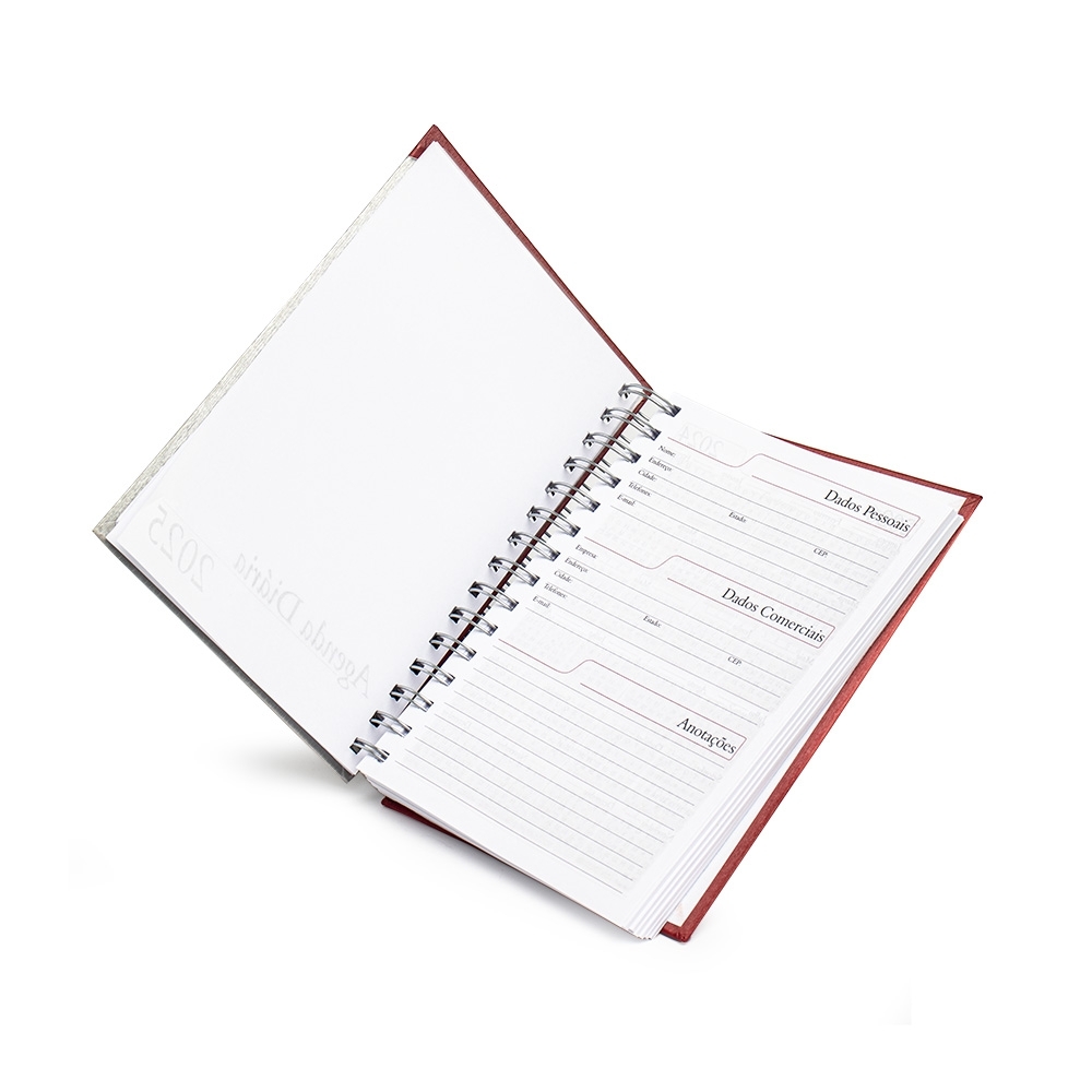 Agenda diária 2025 metalizada com detalhe colorido em diagonal. Possui espiral, “Bolso” plástico atrás da capa, dados pessoais, calendários 2024 2026, mapa do Brasil, mapa-múndi, índice telefônico e planejamento.