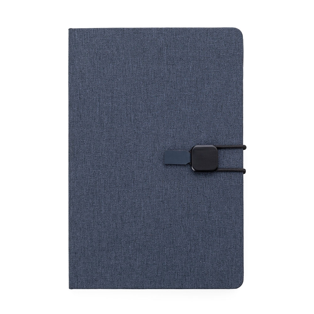 Bloco de anotações com capa dura em tecido de poliéster. Miolo com 80 folhas pautadas na cor bege. Possui elástico lateral com detalhe em couro sintético para fechamento do caderno. Altura :  21,4 cm Largura :  14,4 cm Espessura :  1,5 cm Medidas aproximadas para gravação (CxL):  12 cm x 8 cm Peso aproximado (g):  292