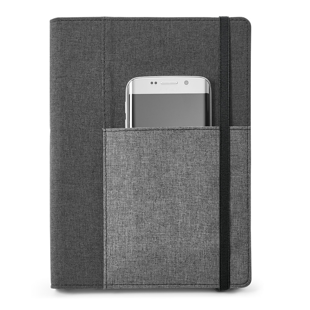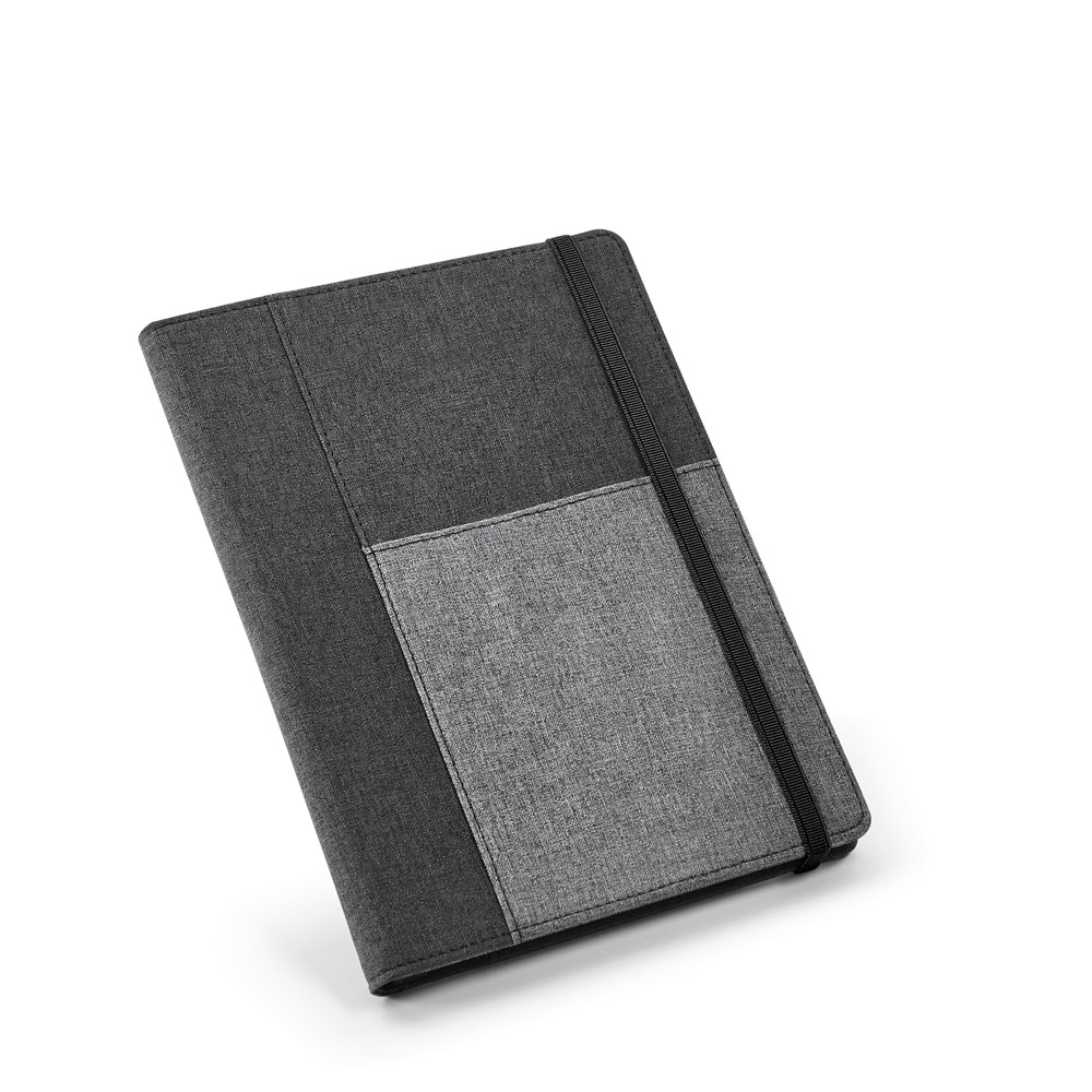 Capa de tecido em poliéster, com caderno A5 removível com 160 páginas lisas. O interior contém um bolso interior e suporte para esferográfica (não inclusa). Fornecida em embalagem de TNT. 160 x 220 mm | Bolsa: 205 x 250 mm