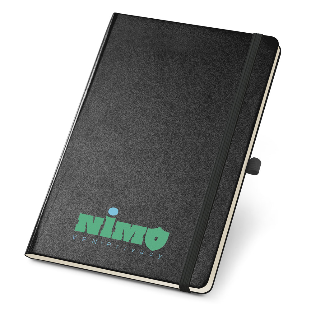 Caderno A5 de capa dura em PVC com 160 páginas pontilhadas em cor marfim, elástico, fita separadora, bolso interior e suporte para esferográfica (não inclusa). 137 x 210 mm