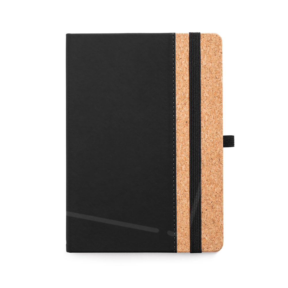 Caderno A5 com capa dura em cortiça e PU e 192 páginas pautadas em cor marfim. Contém elástico, fita separadora e suporte para esferográfica (não inclusa). Fornecido em bolsa de TNT. 140 x 210 mm