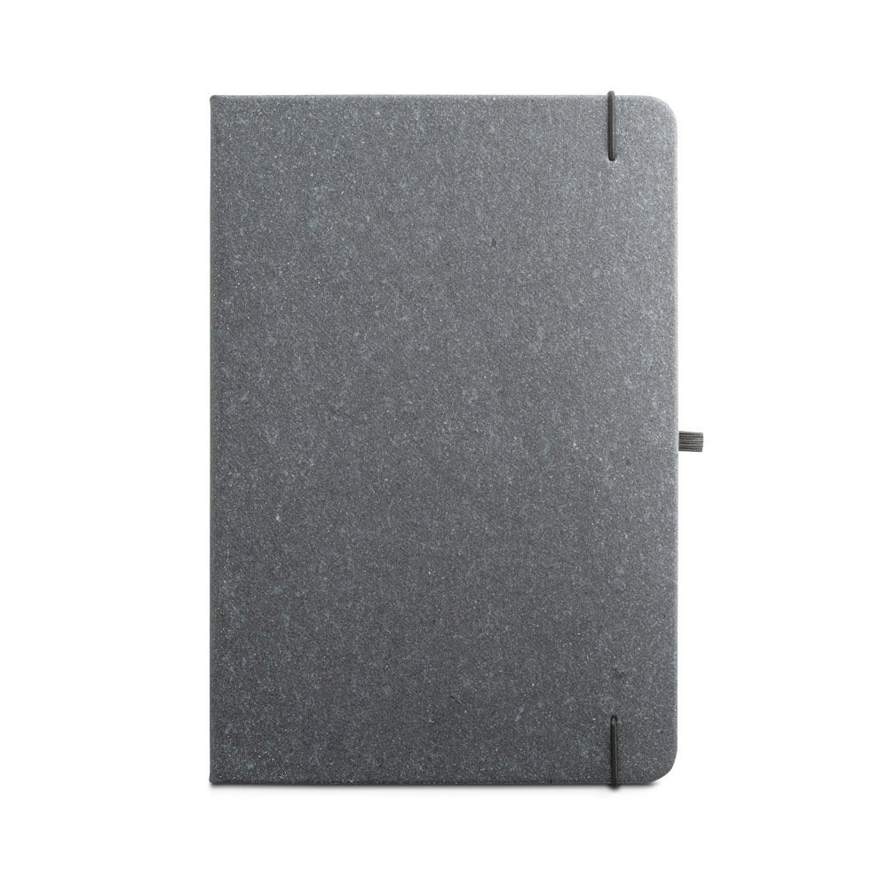 Caderno A5 de capa dura em couro 70% reciclado. Contém 192 páginas pautadas cor marfim em papel proveniente de gestão florestal sustentável, suporte para esferográfica (não inclusa), elástico e fita separadora em preto. Contém bolso interior. 140 x 210 mm